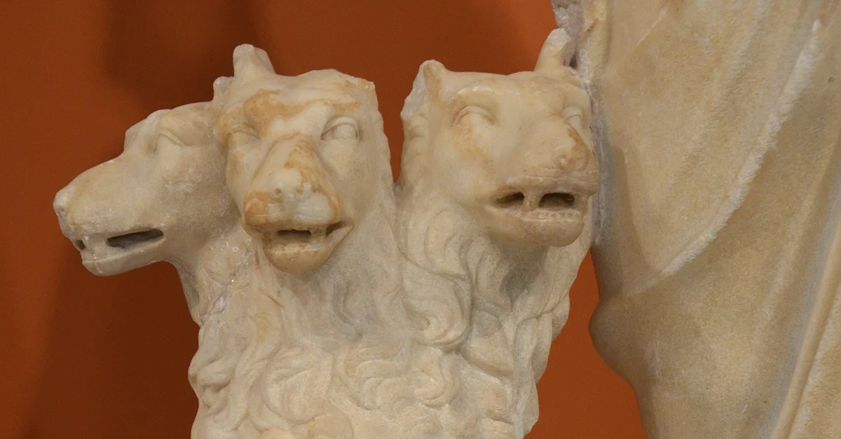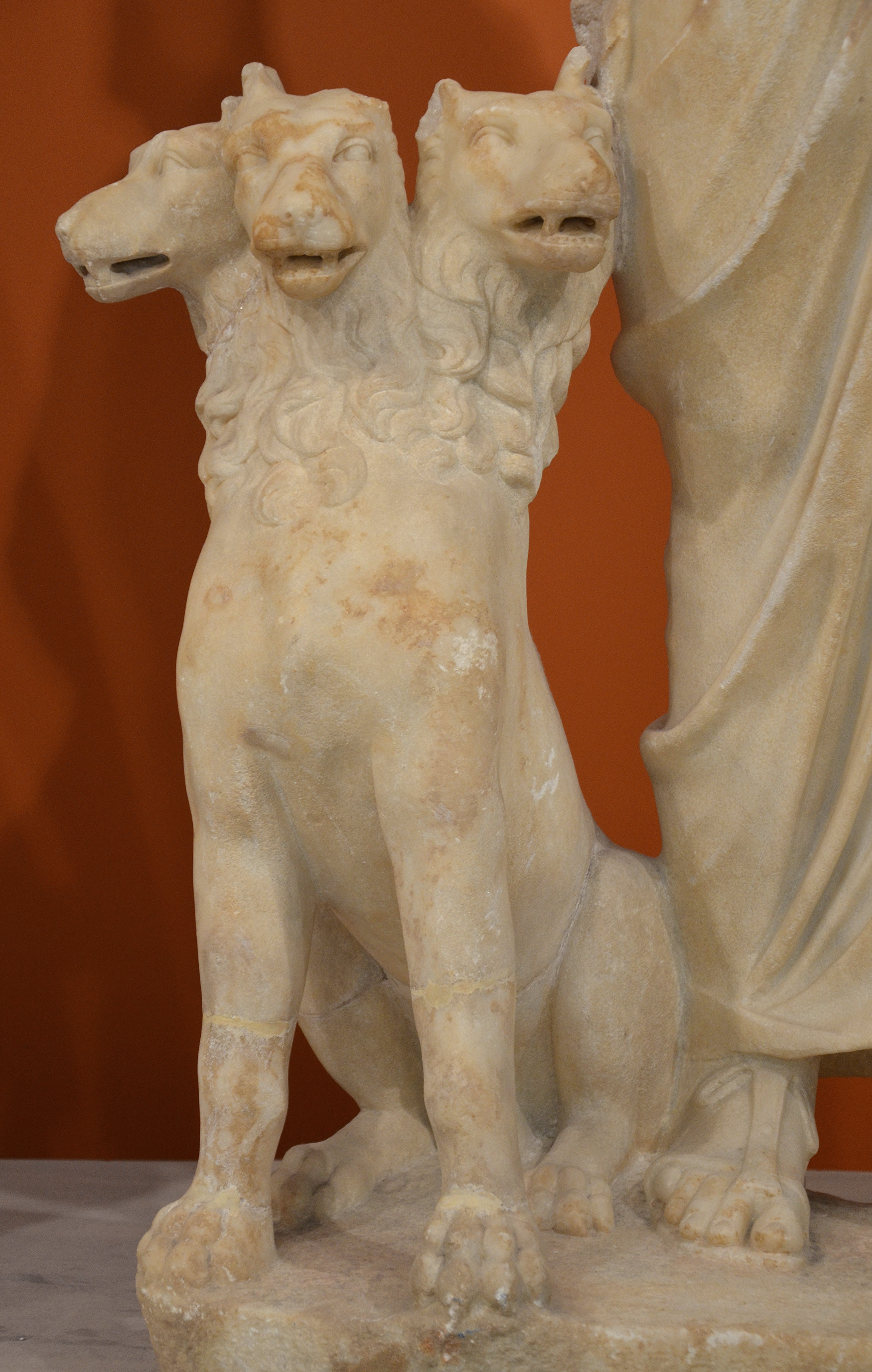 Cerberus, detail of a statue group of Persephone (as Isis) and Pluto (as Serapis). From the Sanctuary of the Egyptian Gods at Gortyna. Dated to the mid-2nd century CE.