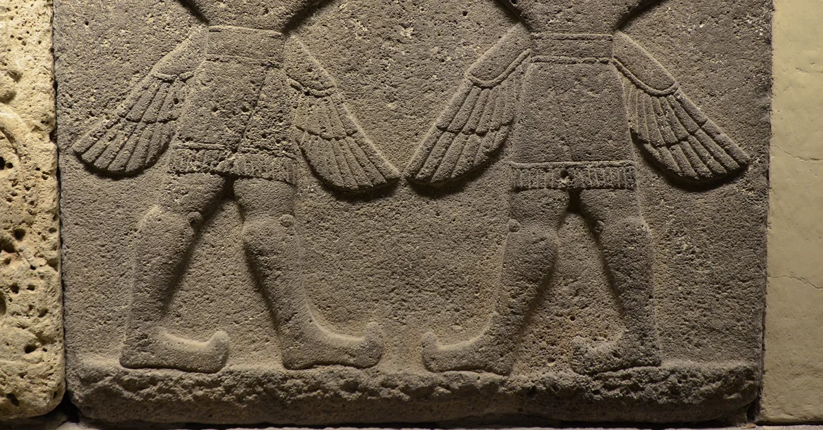 Relief orthostat (stone slab at the base of a wall) depicting two winged griffin demons, depicted as bird-headed with a human body. From Carchemish, Turkey. Dated to the Late Hittite period, 9-7th century BCE.