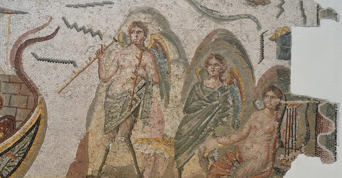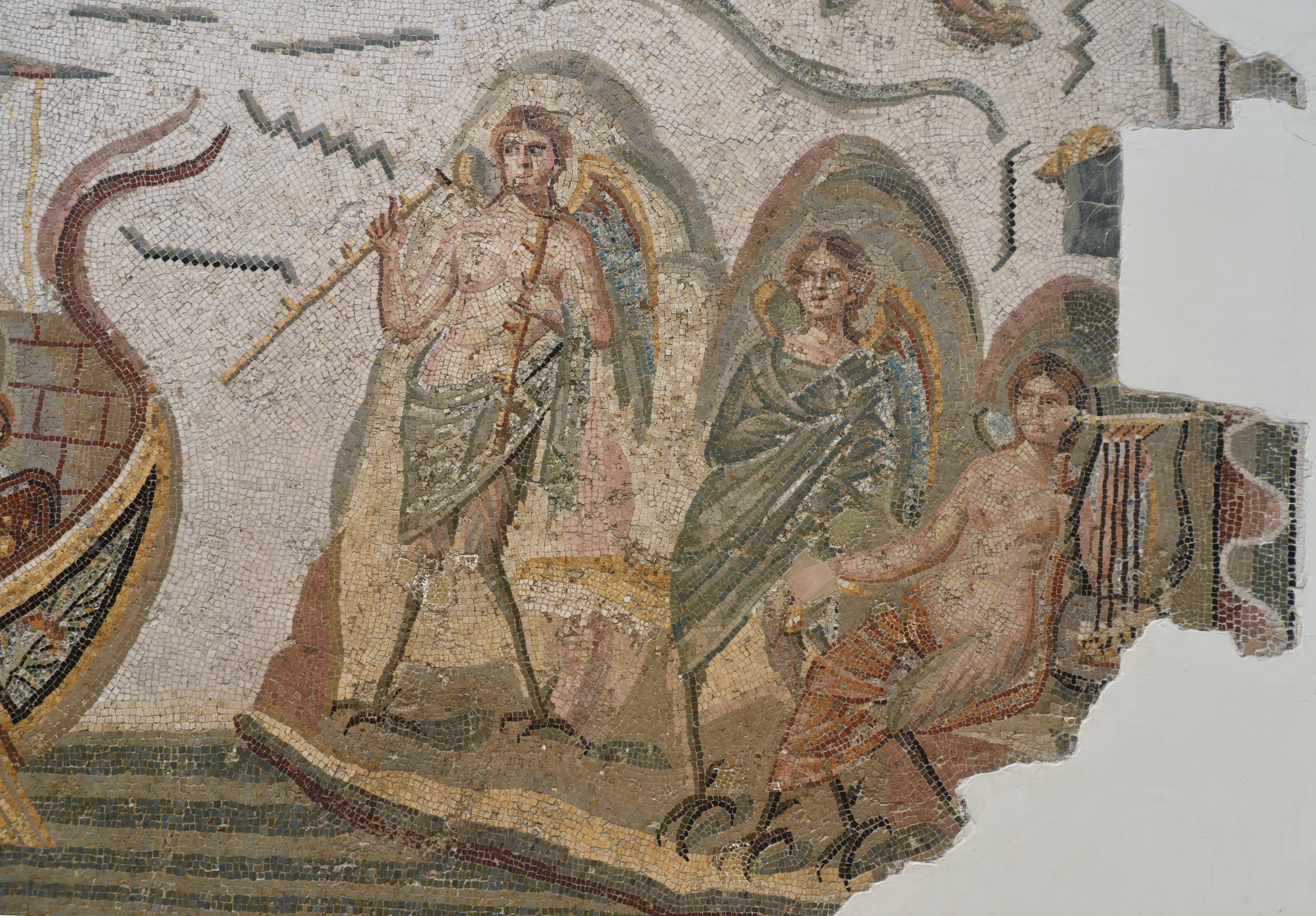 Detail of the Odysseus and the Sirens mosaic from Dougga (Tunisia) depicting Odysseus' encounter with the Sirens. The three Sirens stand on a rocky island. The creatures are depicted with the legs and wings of birds and hold a variety of musical instruments. Their irresistible songs are said to enchant and hypnotize those who hear them, often leading sailors to shipwreck on rocky shores. (The Odyssey, Homer, 39-54). The mosaic is dated to the 2nd century CE.