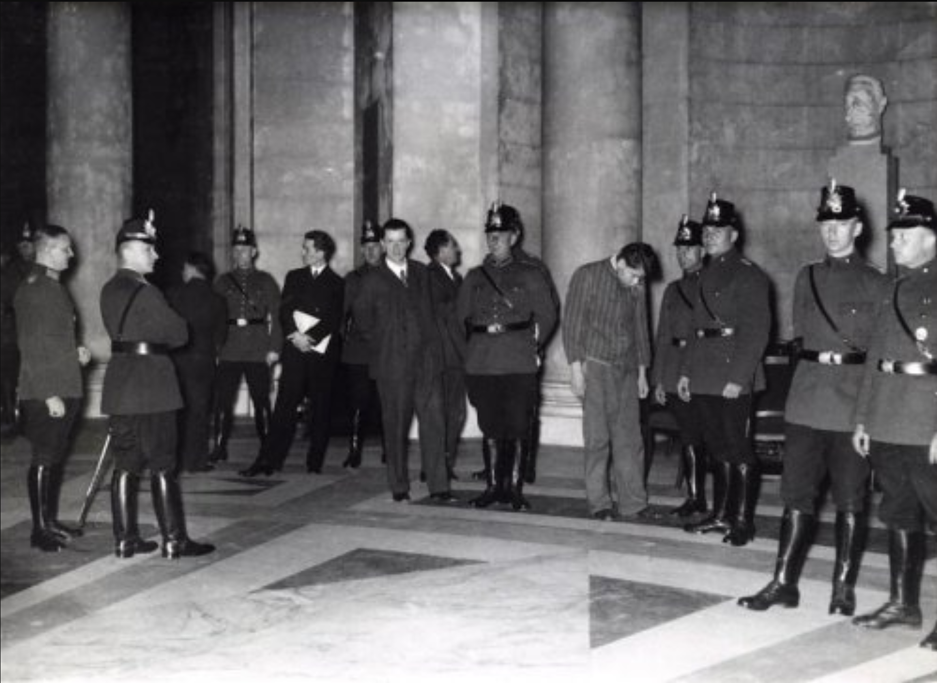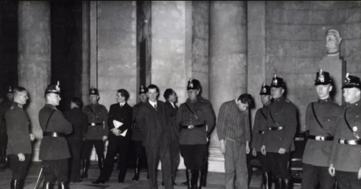 A photograph of Marinus van der Lubbe (1909-34) under police arrest. Charged by the Nazi government with starting the Reichstag Fire of 27 February 1933, van der Lubbe was found guilty and executed. (National Archives of the Netherlands)