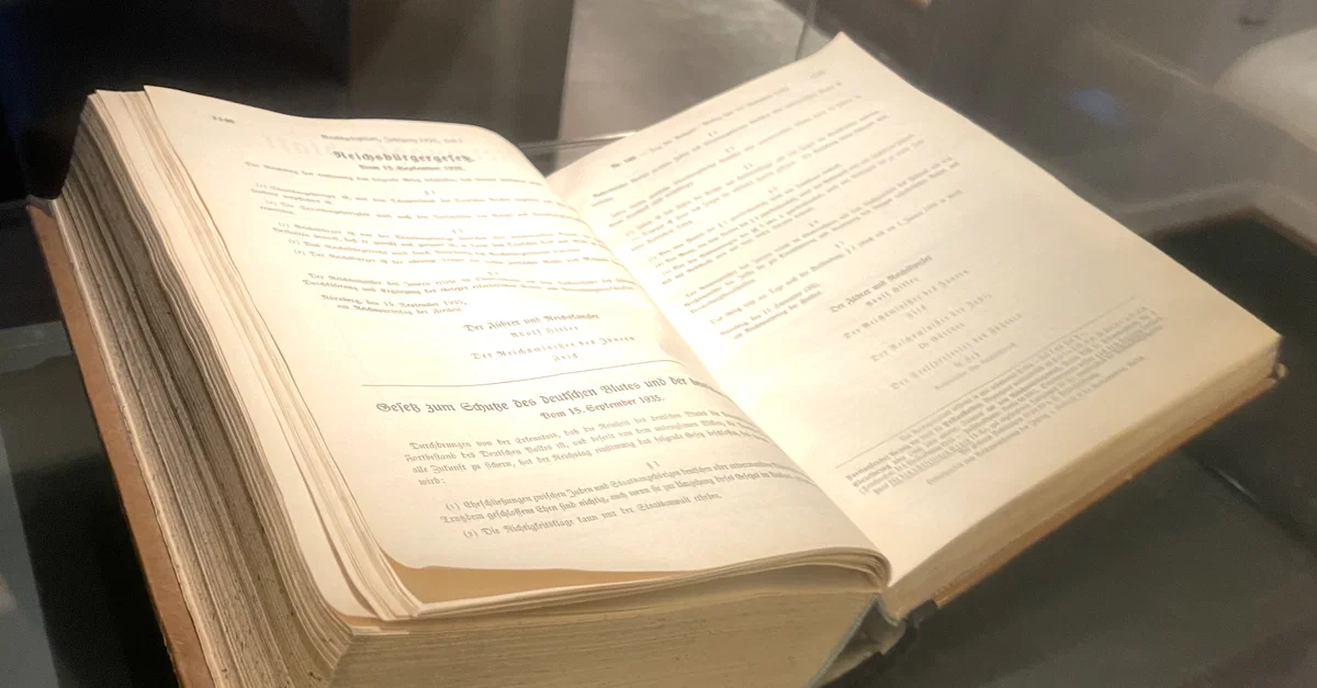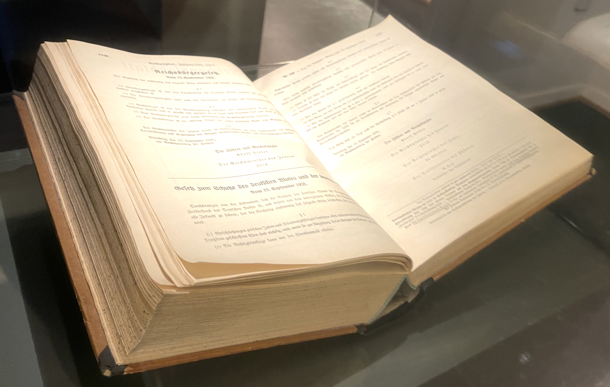 A book containing the Nuremberg Laws, a set of race and citizenship laws for Jewish people and German citizens which were created in Nazi Germany in September 1935. Part of an exhibition at the Oslo Center for Studies of the Holocaust and Religious Minorities.