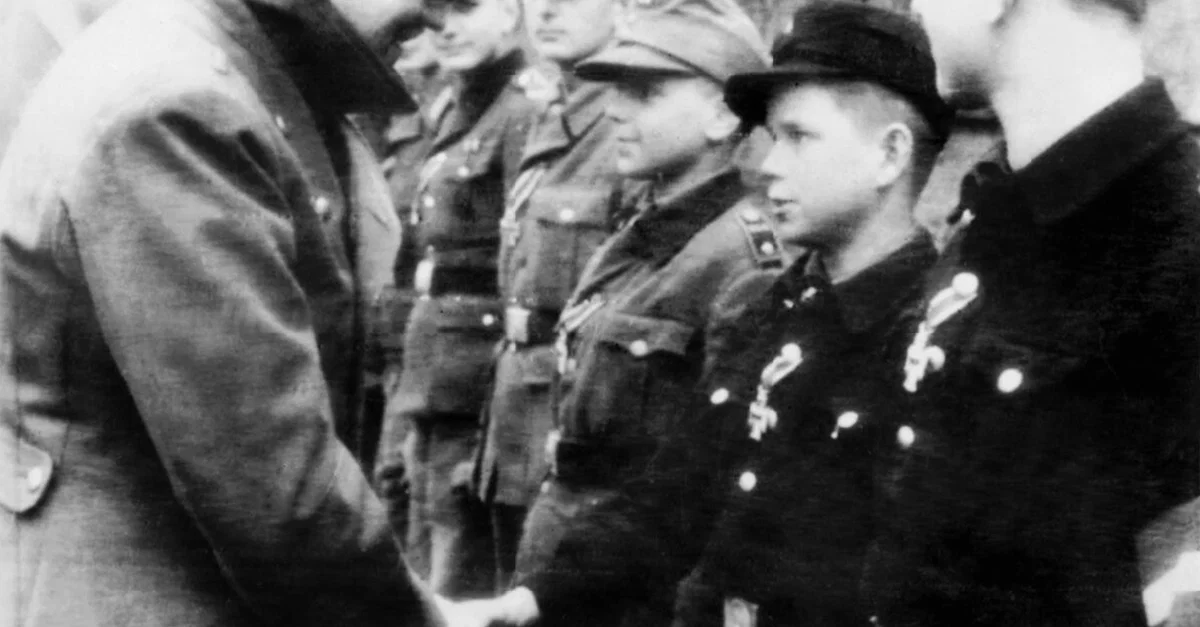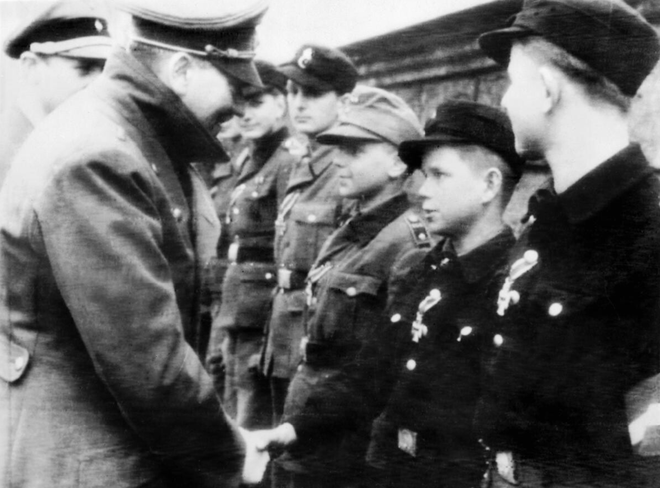A 1945 photograph showing the leader of Nazi Germany Adolf Hilter (1889-1945) awarding medals to members of the Hitler Youth who fought in battle, including Alfred Czech. (Imperial War Museums)