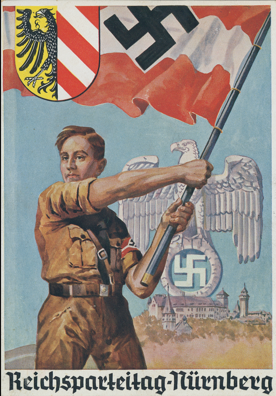 A 1936 German postcard showing the coat of arms and castle of Nuremberg and a member of the Hitler Youth, a Nazi youth organization founded in 1922.