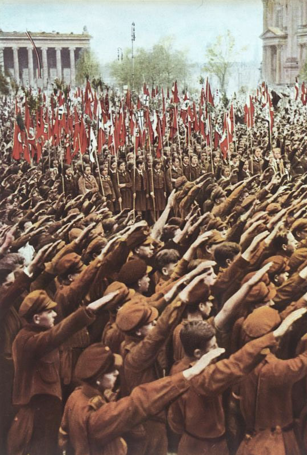 A 1933 colourised photograph of members of the Hitler Youth, a Nazi youth organization founded in 1922, saluting at a rally in Berlin. (Bild 147-0510, German Federal Archives)