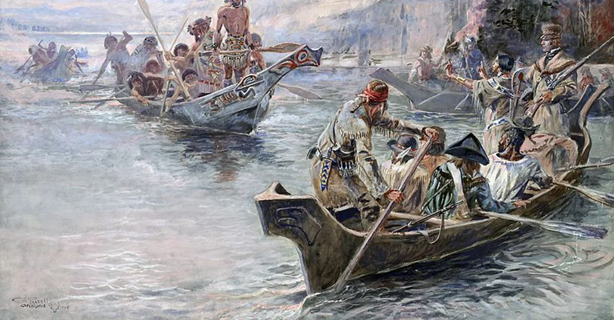 The Lewis and Clark Expedition meet the Chinook people on the Lower Columbia River in October 1805, watercolor on paper by Charles M. Russell, 1905.