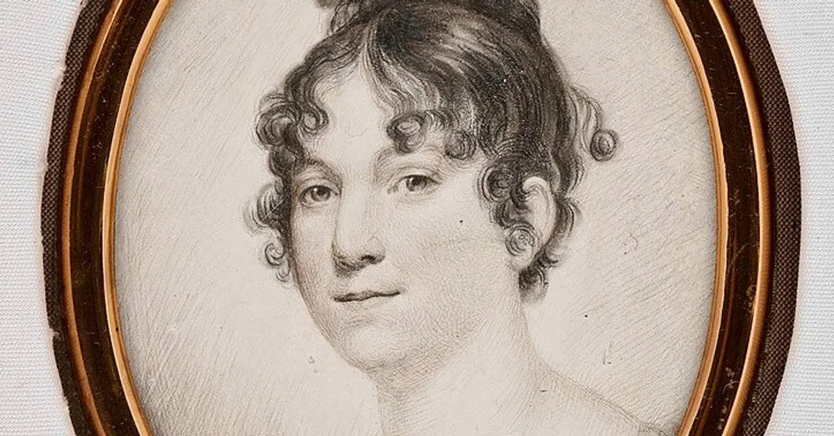 Dolley Madison, American First Lady, graphite on ivory miniature by Thomas Christian Lubbers after an original by Gilbert Stuart, January 1820.