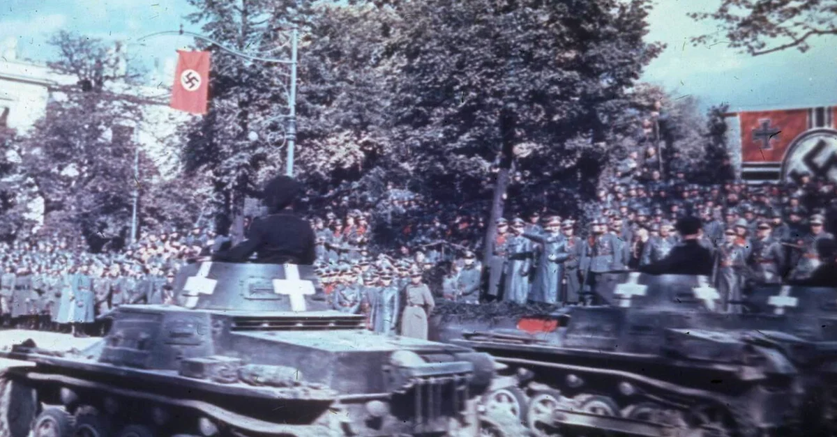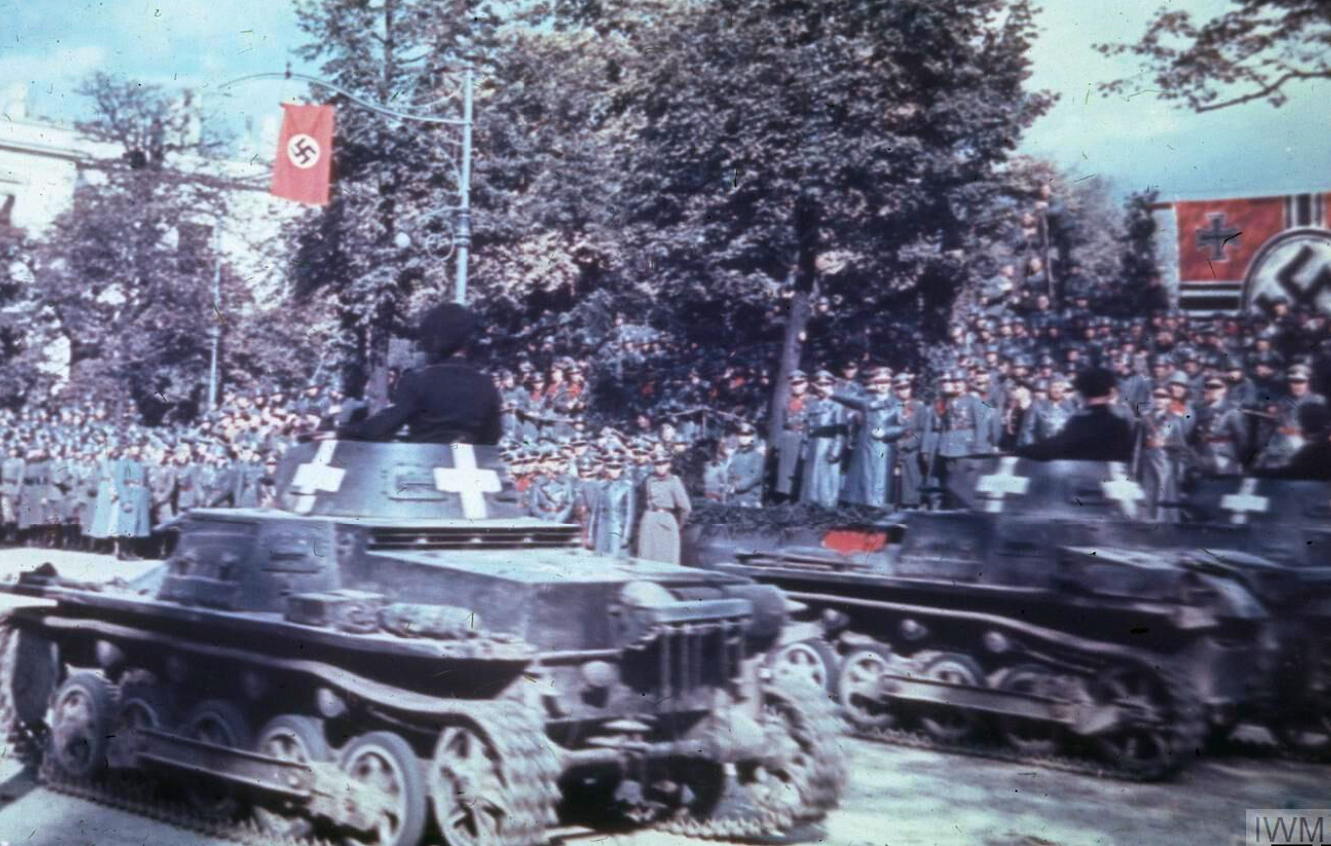 Adolf Hitler (1889-1945) reviewing a victory parade in Warsaw following the German invasion of Poland in September 1939. Photo taken on 5 September. (Imperial War Museums)