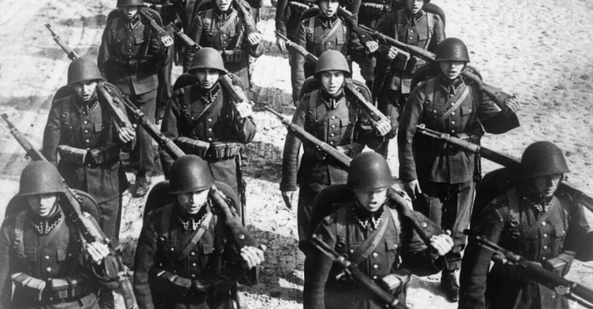 A photograph showing Polish troops marching to battle following the German invasion of Poland in September 1939. (Imperial War Museums)