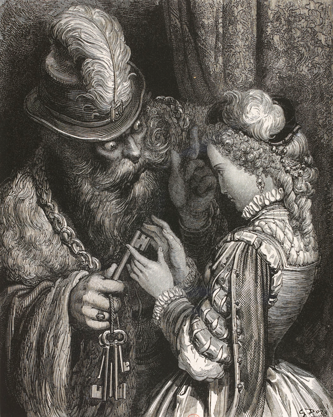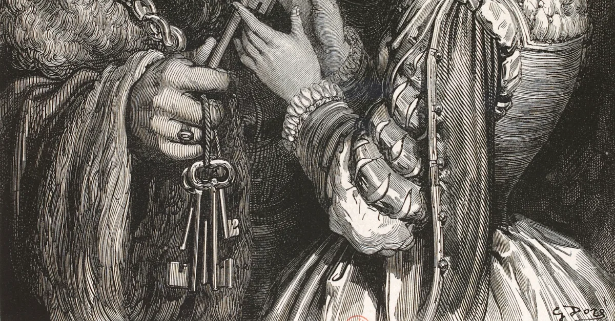 Wood engraving showing Bluebeard and his wife by Gustave Doré (1832-83). Bluebeard is a character from a French folktale. (National Library of France)