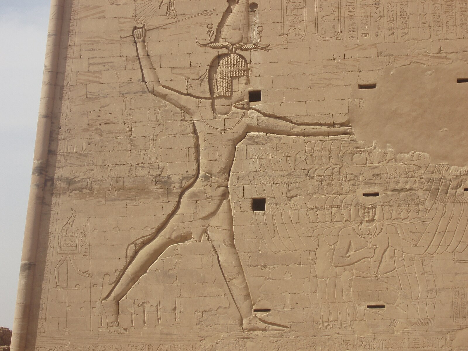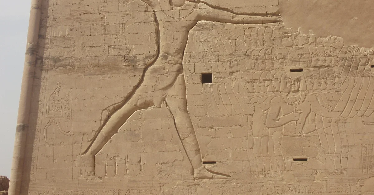 Relief from the Temple of Horus at Edfu, depicting Ptolemy XII (r. 80-51 BCE) smiting his enemies. 1st century BCE.