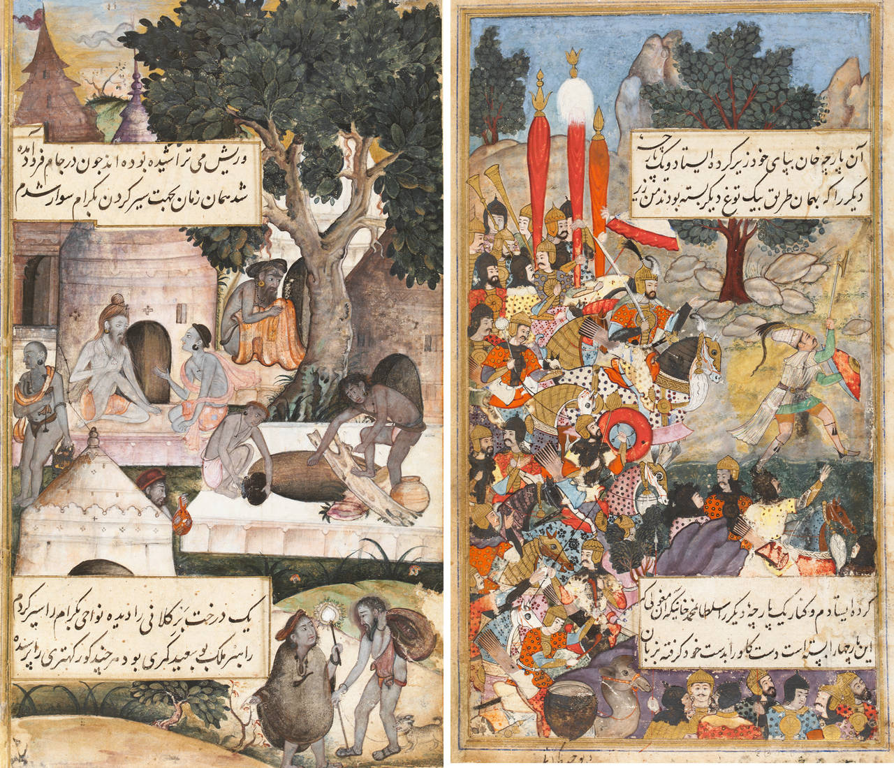 Watercolour on paper, painting on right by Devji Gujarati, c.1590, Mughal. Museum nos. IM.260-1913, IM.261-1913. © Victoria and Albert Museum, London