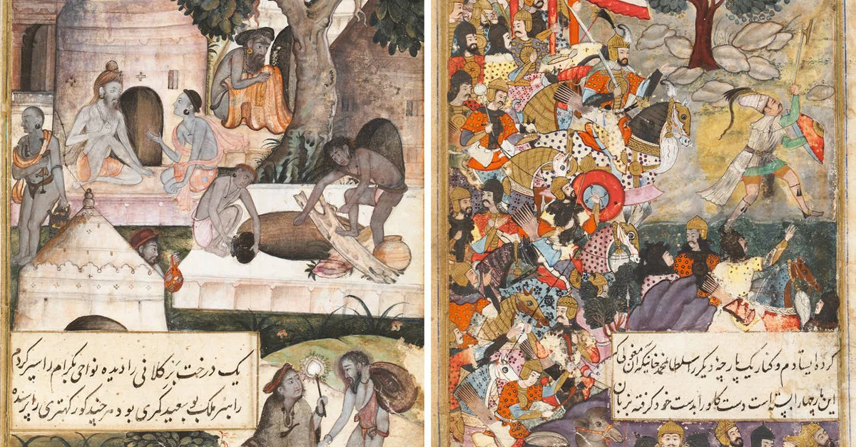 Two detached folios from the Baburnama - the book of Babur which tells the life story of the Emperor Babur (1483-1530) who founded the Mughal Empire in 1526. The left folio shows ascetics at a shrine while on the right is a ceremony where royal standards are acclaimed.