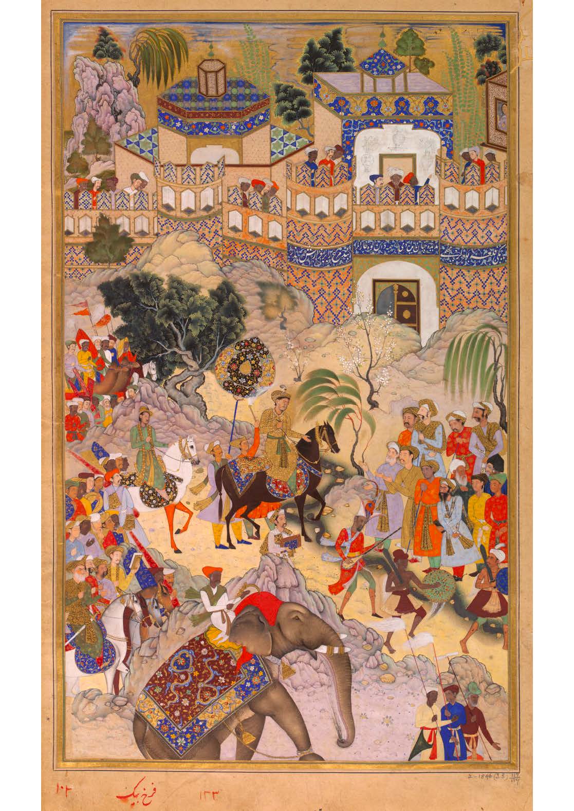 The third Mughal Emperor Akbar's (1542-1605) triumphant entry into the city of Surat. A detached folio from a copy of the Akbarnama - the book of Akbar which chronicles his life and reign. Opaque watercolour and gold on paper, by Farrukh Beg, 1590 – 95, Mughal. Museum no. IS.2:117-1896. © Victoria and Albert Museum, London