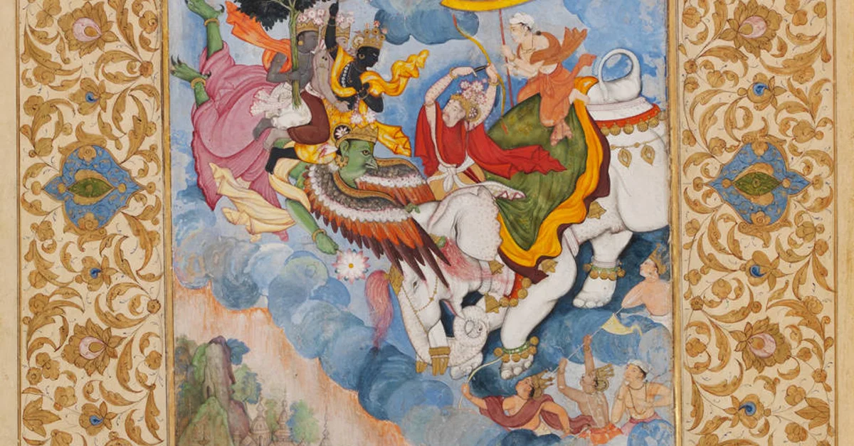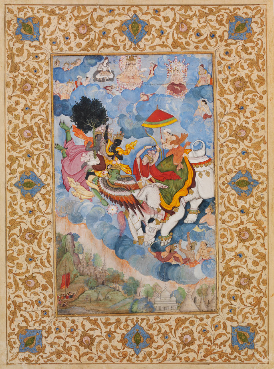 Krishna in combat with Indra, detached folio from a copy of the Harivamsa. Opaque watercolour and gold on paper, about 1590, Mughal. Museum no. IS.5-1970. © Victoria and Albert Museum, London