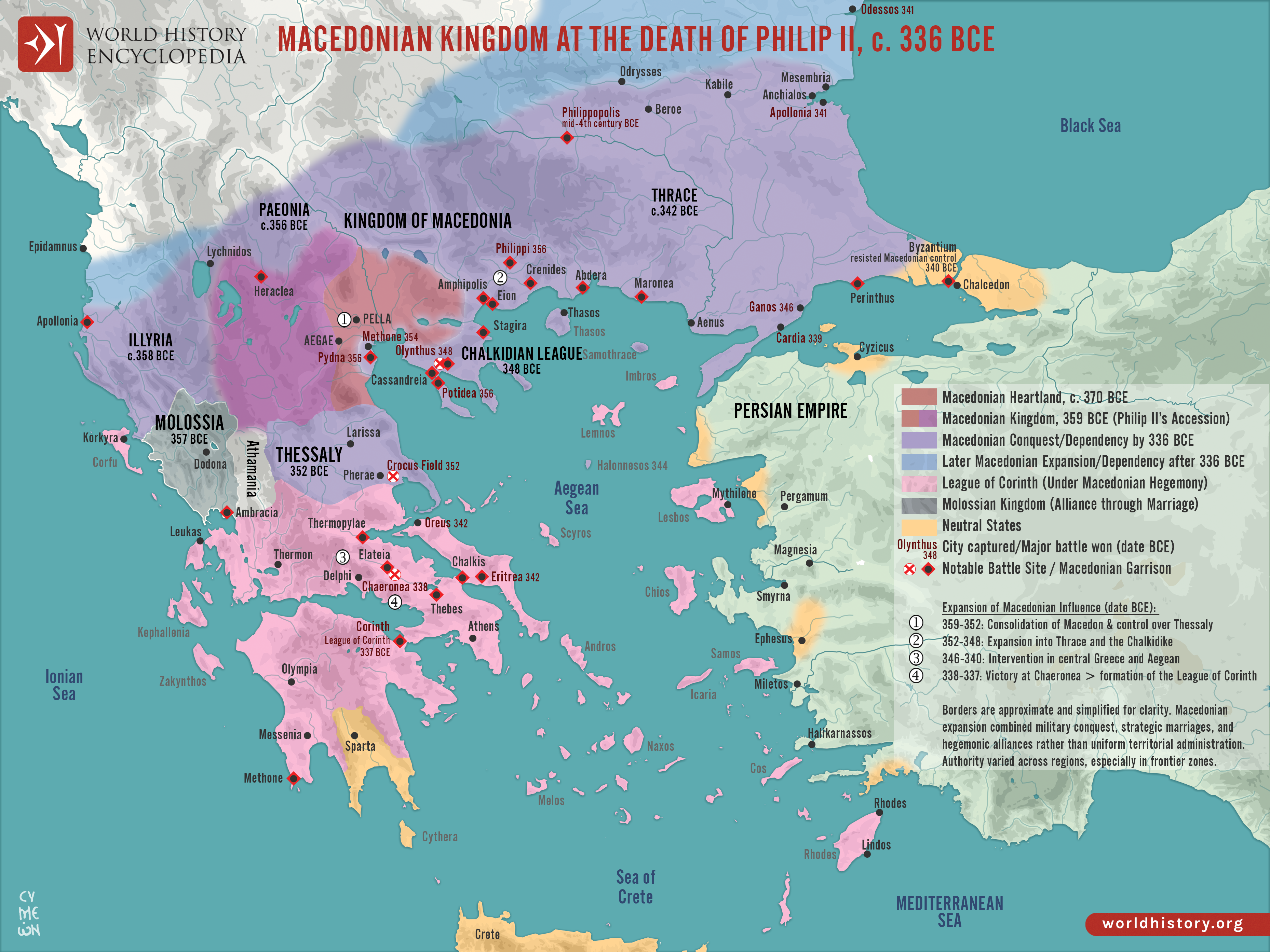 Netchev, S. (2026, April 29). Map of the Macedonian Kingdom at Philip II's Death c.336 BCE: Legacy and the Road to Imperial Expansion. World History Encyclopedia. https://www.worldhistory.org/image/19668/map-of-the-macedonian-kingdom-at-philip-iis-death/