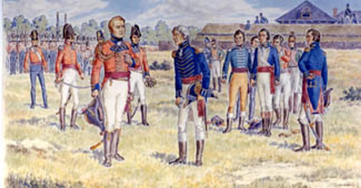 US Brigadier General William Hull surrenders Fort Detroit and his army after a brief siege to British Major General Isaac Brock and his ally Shawnee chieftain Tecumseh, on 16 August 1812. Illustration by J. C. H. Forster, c. 20th century.