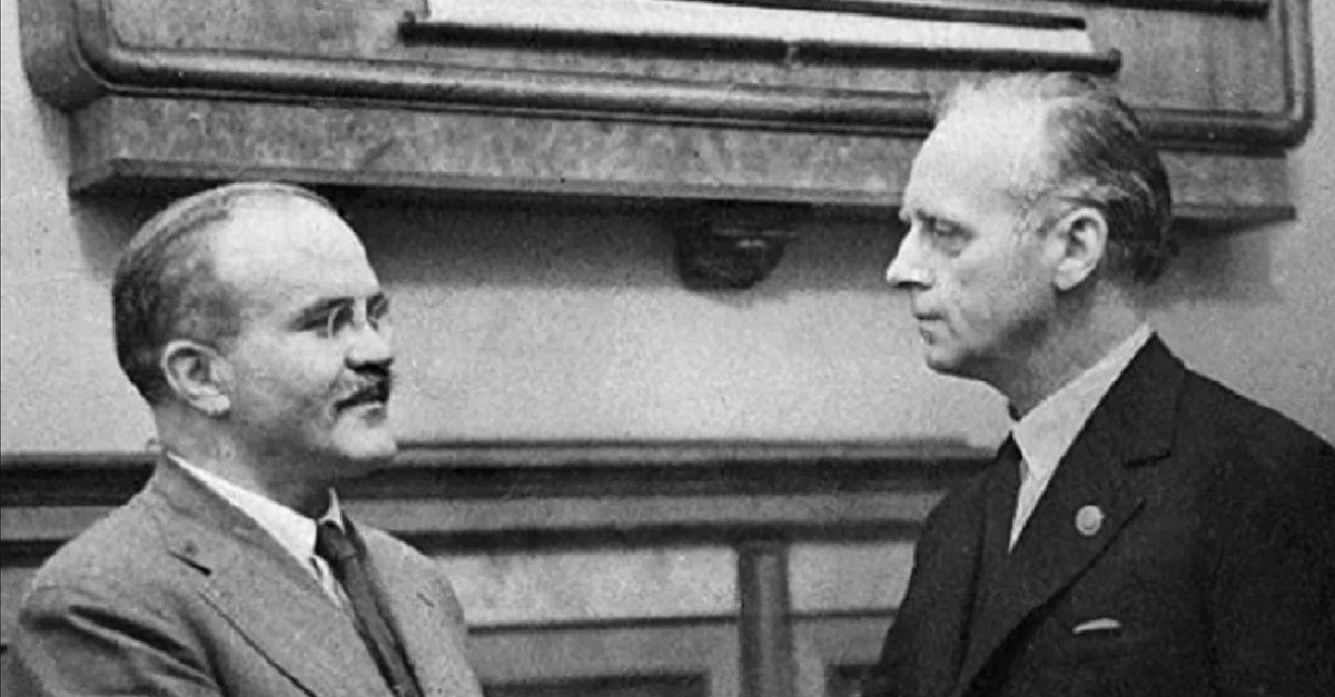 A 1939 photograph of Vyacheslav Molotov (1890-1986), the People’s Commissar of Foreign Affairs for the USSR, and Joachim von Ribbentrop (1893-1946), German foreign minister, during negotiations of the Nazi-Soviet Pact.