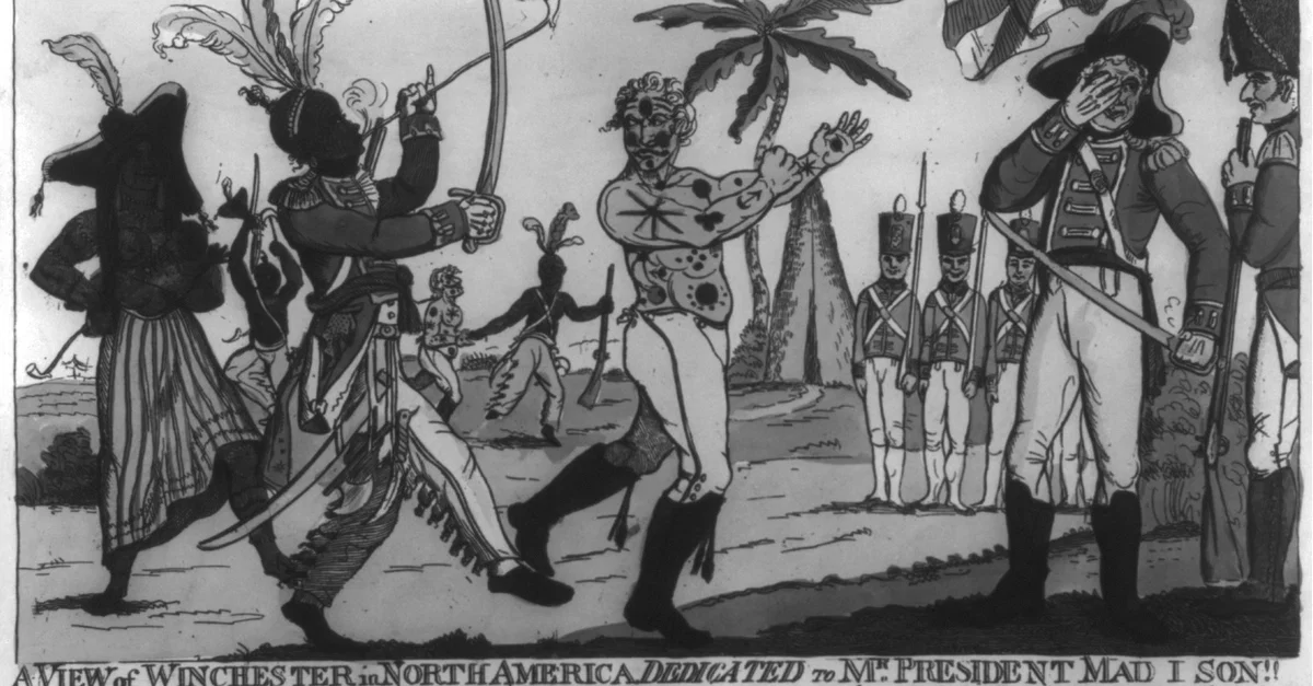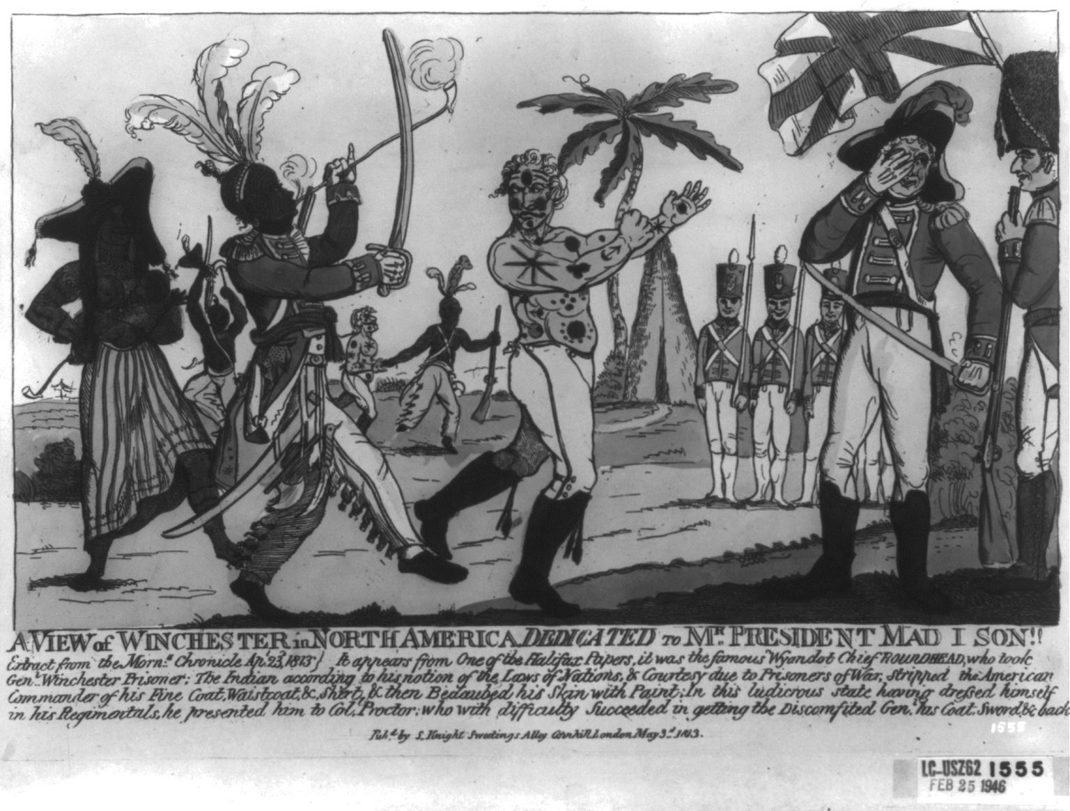 A view of Winchester in North America - dedicated to Mr. President Mad I Son!!, satirical print showing General Winchester captured during the second Battle of the River Raisin, 1813.