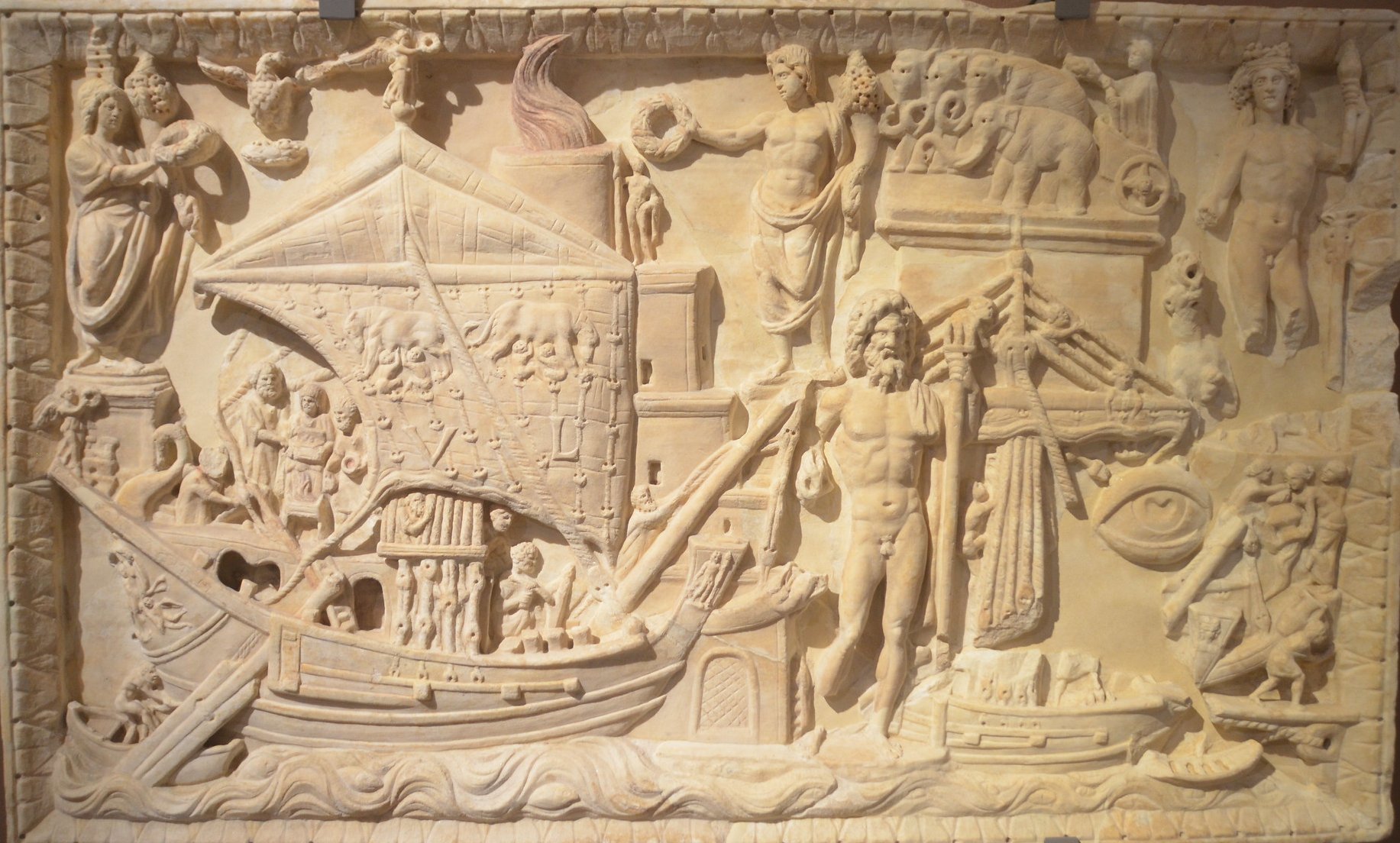 Roman marble relief with harbor scene, photographed at the Exhibition: The Torlonia Marbles. Collecting Masterpieces, Rome, 2021.