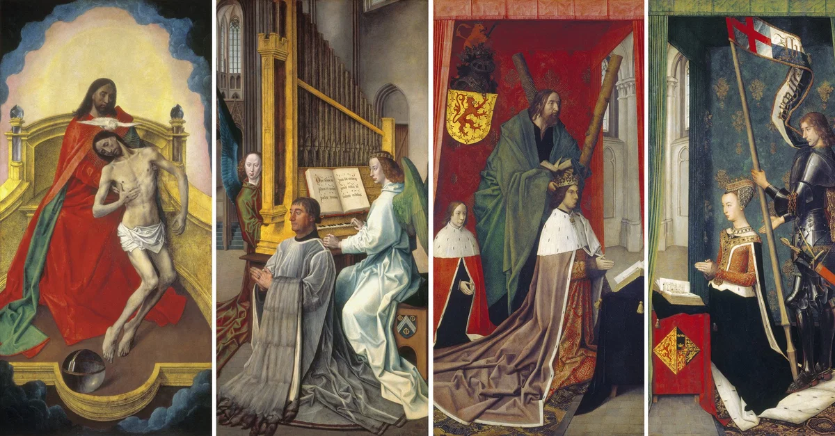The Trinity Altarpiece panels, oil on oak panels by Hugo van der Goes, 1478.