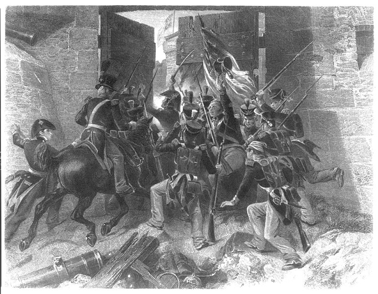 US Colonel Winfield Scott leads the Americans into Fort George at the end of the Battle of Fort George (27 May 1813) during the War of 1812, engraving by Alonzo Chappel, 1857.