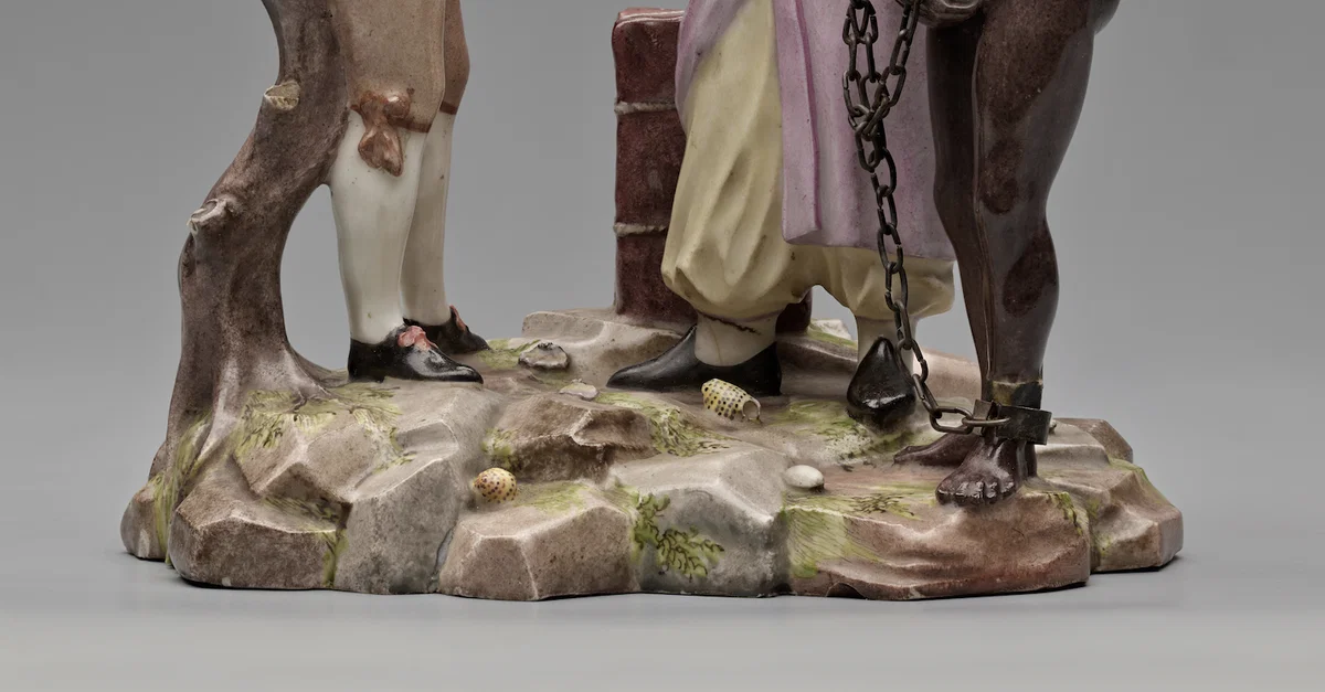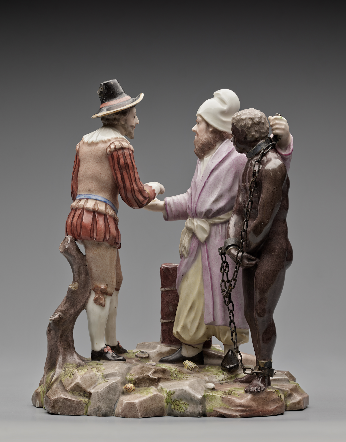 Figurines depicting the sale of an enslaved person. Menschenhandel, manufactory Kilchberg-Schooren, around 1775, painted porcelain. On display at the National Museum Zurich in the Swiss Global Entanglements exhibition from 13.9.2024 - 19.1.2025.
