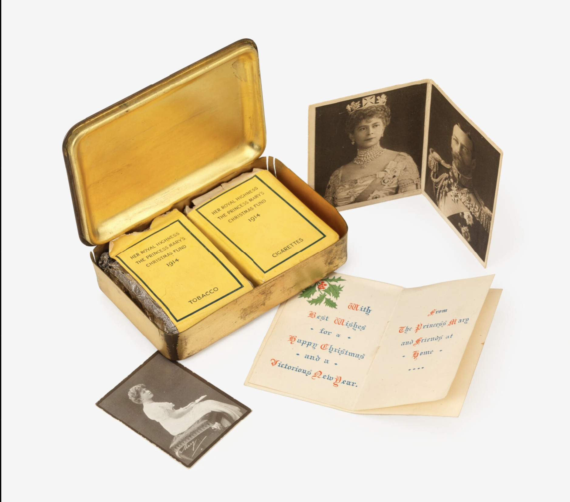 The contents of a Princess Mary's Gift Tin, given at Christmas to all soldiers and sailors in the Brtish armed forces in 1914 during the First World War (1914-18). Princess Mary (1897-1965), daughter of King George V (r. 1910-36), headed the effort to give combattants an embossed brass tin which contained a Christmas card, photographs of the king and royal family, tobacco, a pipe, a packet of cigarettes, and a tinder lighter. For those who did not smoke there was a version with sweets and a pencil case. (Imperial War Museums)