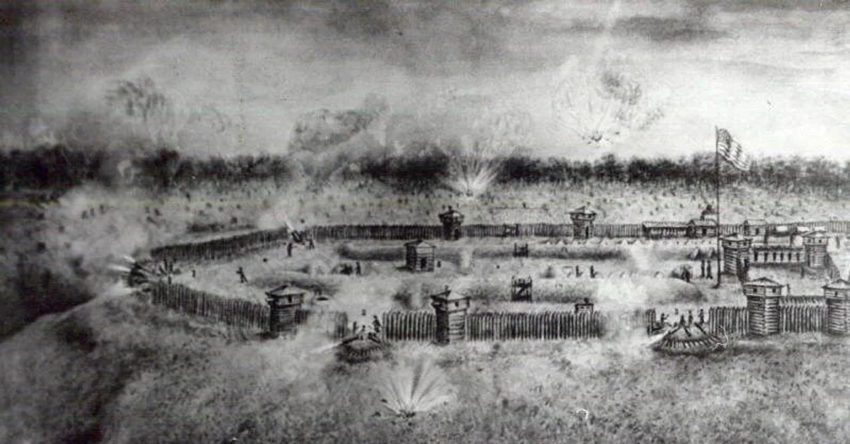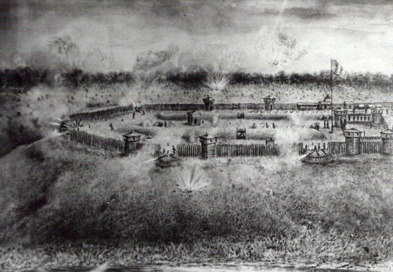 A photo of a painting, depicting the Siege of Fort Meigs (28 April to 9 May 1813) during the War of 1812.