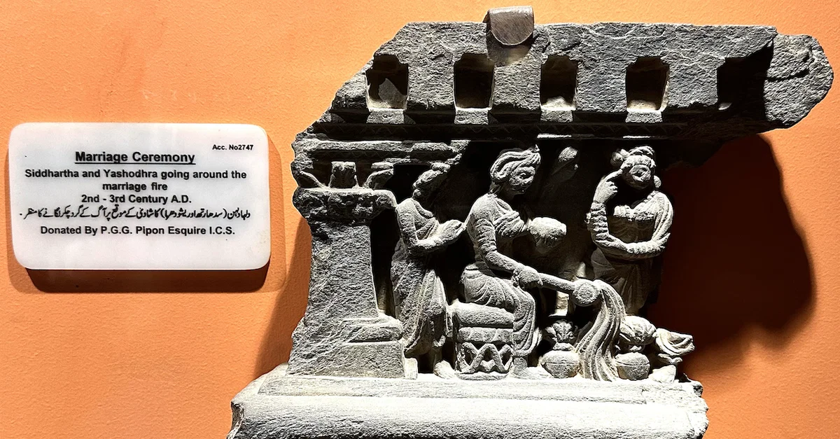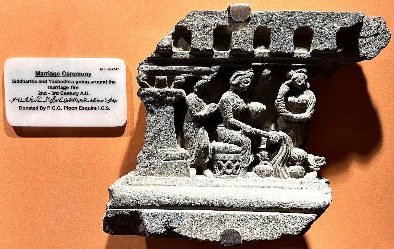 Siddhartha and Yasodhara marriage ceremony, depicting the couple circling around the sacred marriage fire, 2nd-3rd century CE.