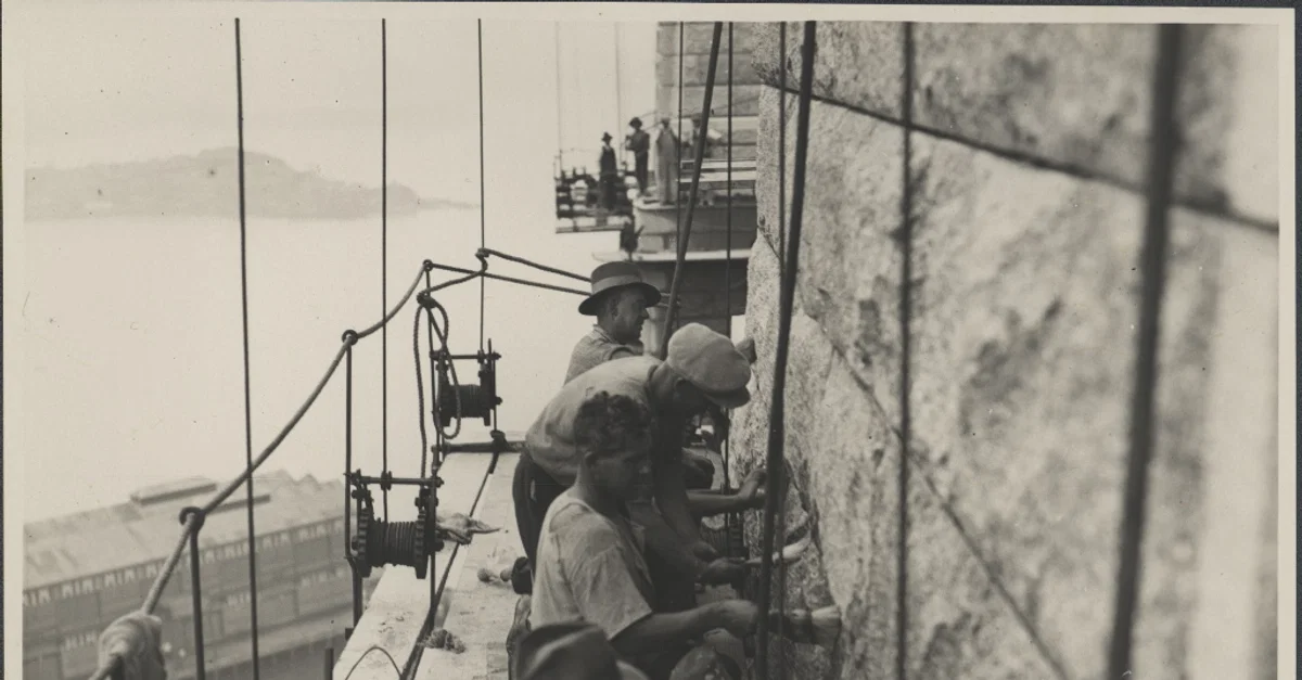 Workers on the southwestern pylon of the Sydney Harbour Bridge, photograph by the New South Wales Department of Public Works, printed by Alfried James Kent, Sydney, New South Wales, Australia, 1932.