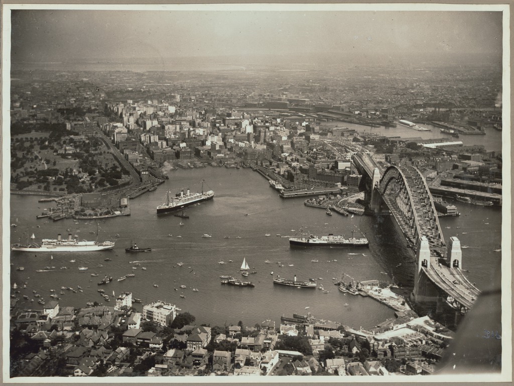 Aerial view of Sydney, Australia and Circular Quay on the day of the official opening of the Sydney Harbour Bridge, photo by E. W. Searle, 19 March 1932.