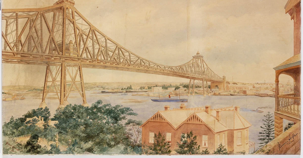 Proposed Sydney Harbour Bridge, watercolour on 3 sheets of paper, on canvas lining, by Norman Selfe, c. 1903. Norman Selfe (1839-1922) was an Australian engineer, naval architect, inventor, urban visionary. In 1902, he won a competition for the design of a harbour bridge with his steel cantilever bridge design. A change in government and an economic slowdown meant Selfe's design was never realised.