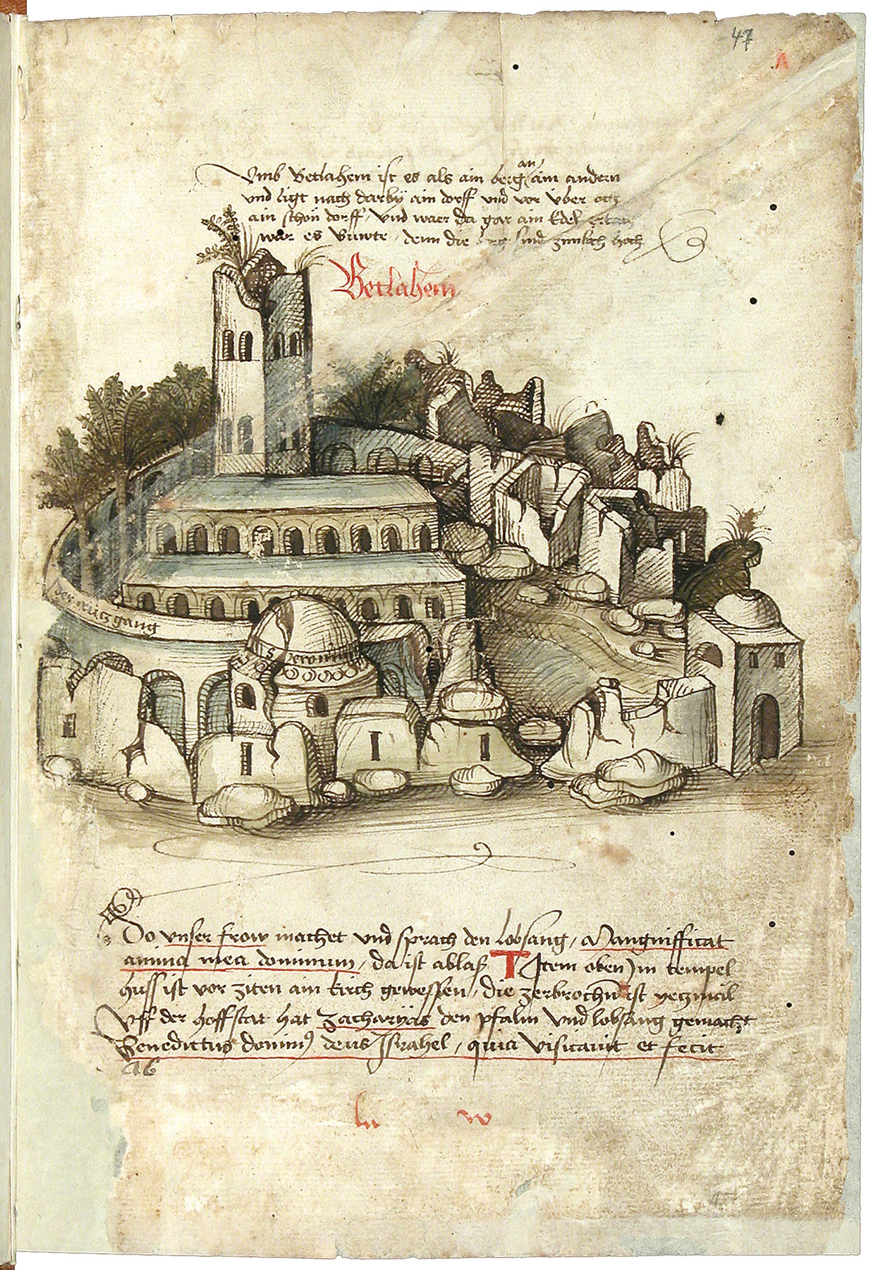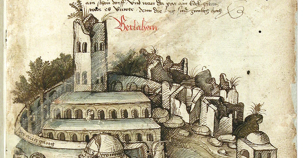 An illustration of the Church of Nativity, Bethlehem, basilica and grounds 1486, as depicted by Konrad von Grünenberg in "Beschreibung der Reise von Konstanz nach Jerusalem" (1487)