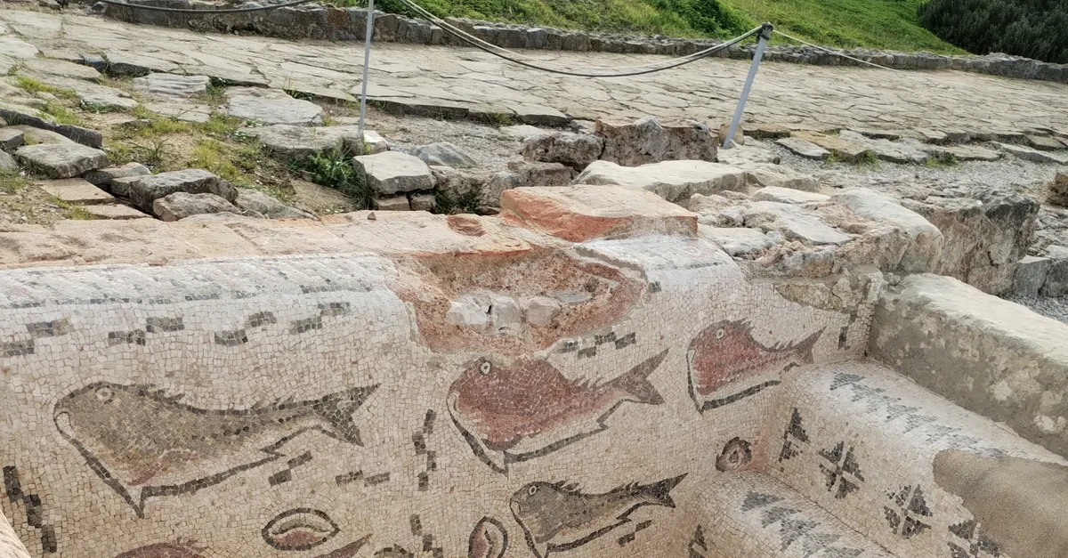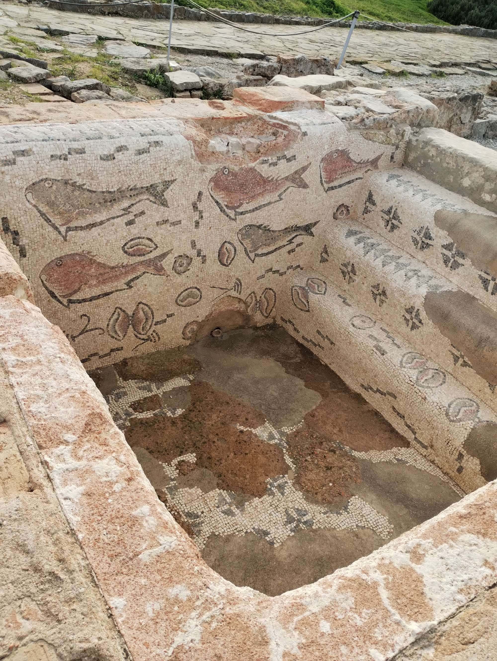 Cold water pool in the frigidarium (cold room) of the Roman baths at the villa at Milreu, southern Portugal. The interior of the pool is decorated with mosaics depicting fish and mussels. 4th century CE.