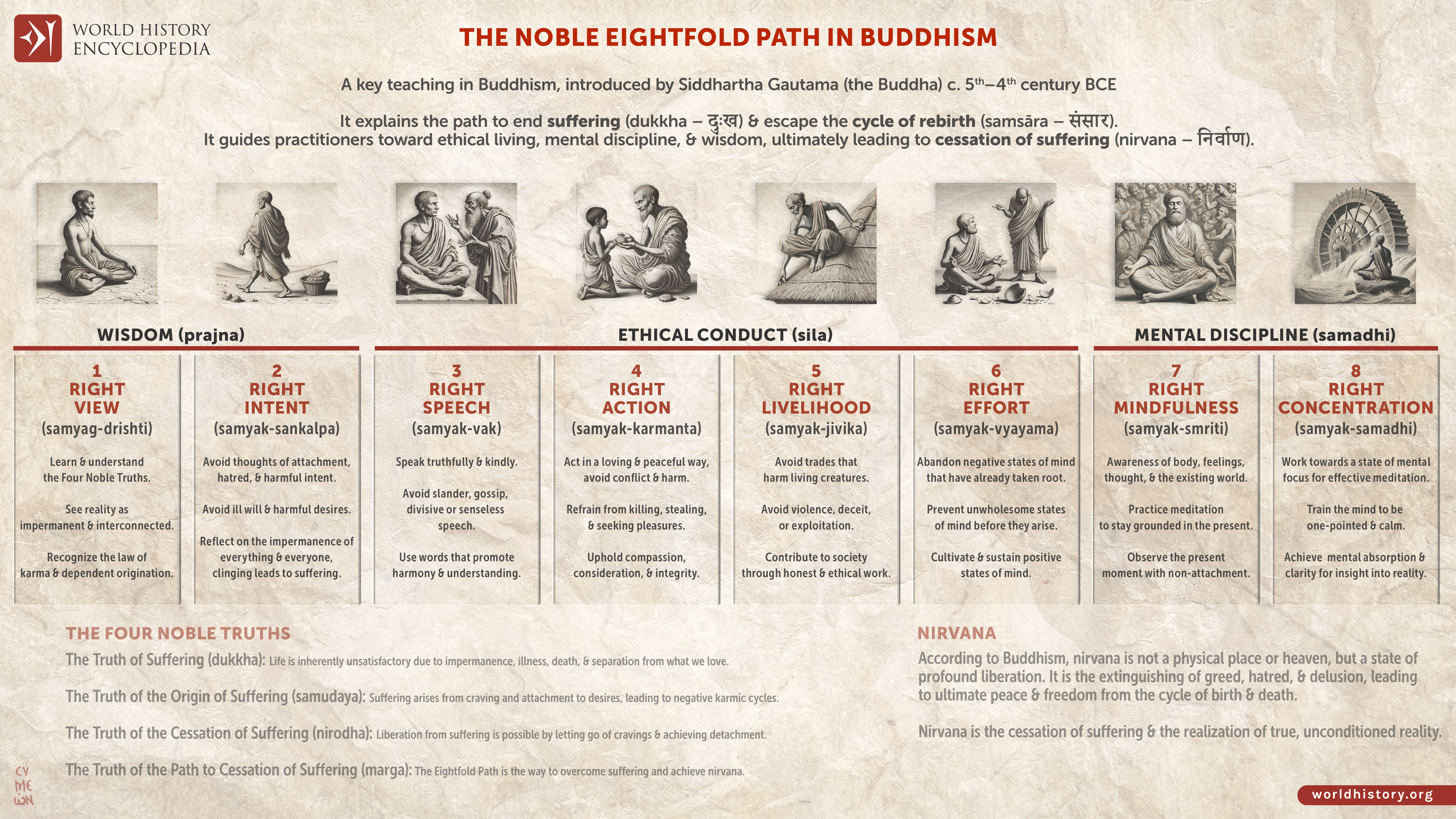 This infographic illustrates the Eightfold Path (आर्याष्टाङ्गमार्ग", Āryāṣṭāṅgamārga), a core teaching in Buddhism, established by Siddhartha Gautama, the Buddha, over 2,500 years ago as a way to overcome suffering and achieve enlightenment. It outlines a practical framework for ethical living, mental discipline, and the cultivation of wisdom. The path consists of eight interconnected practices, including right view, intention, speech, action, livelihood, effort, mindfulness, and concentration. These principles guide adherents toward a balanced and mindful life, free from attachment and ignorance, ultimately leading to liberation (nirvana). Rooted in the Buddha's teachings in ancient India, the Eightfold Path is seen as a timeless guide for spiritual development and self-transformation.