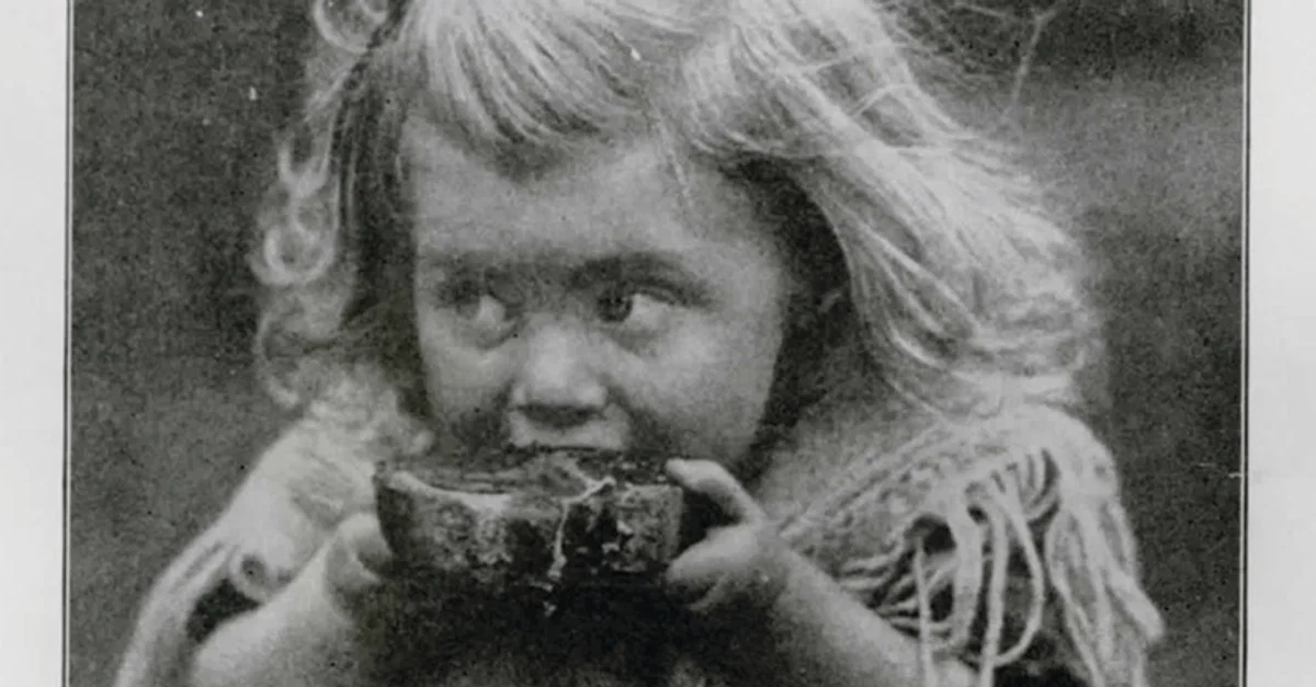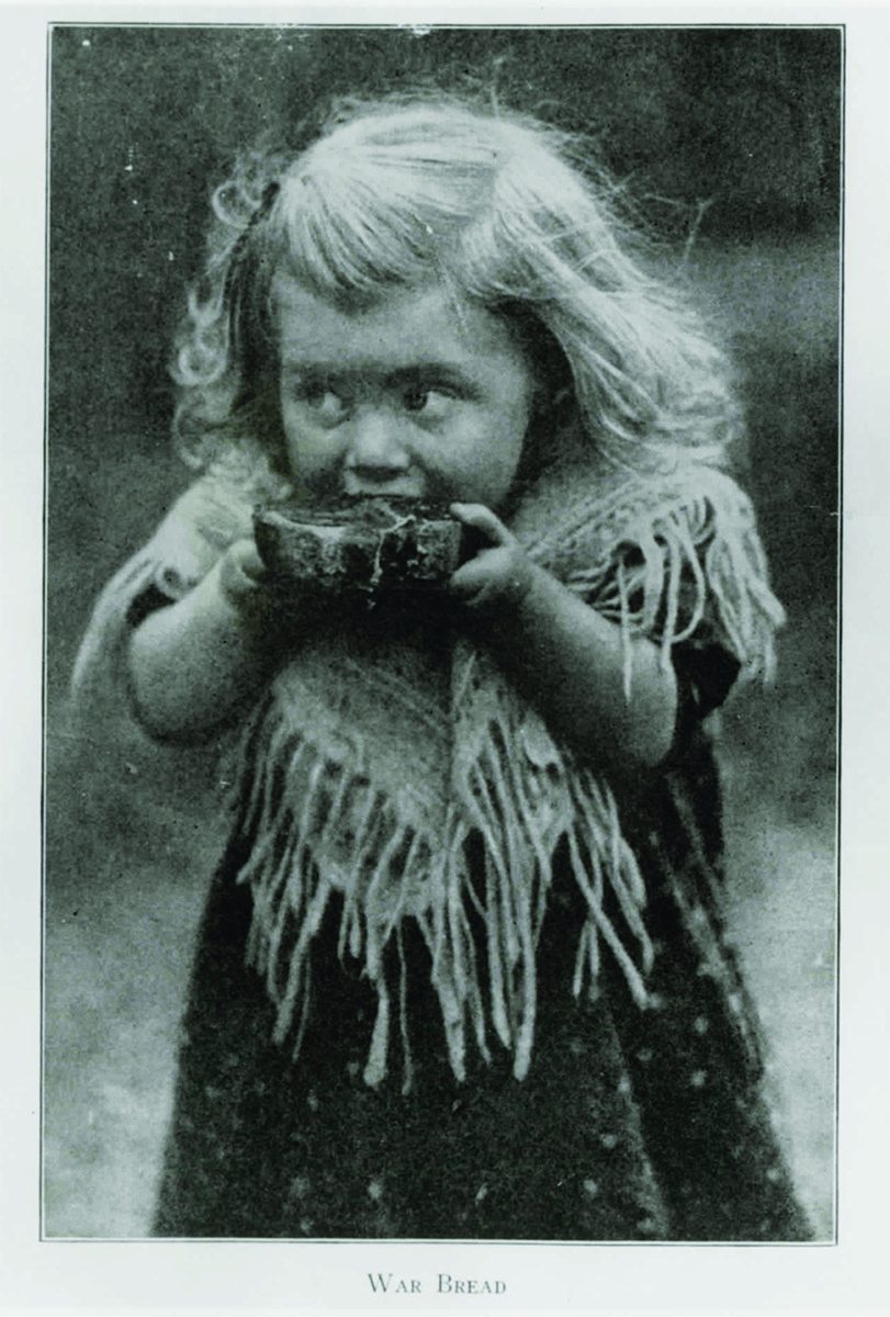 A young girl eating war bread during the First World War (1914-1918).