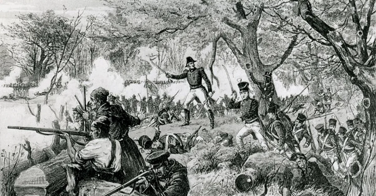 Battle of Chateauguay (26 October 1813) between Canadian and US forces during the War of 1812. Illustration by Henri Julien, published in Le Journal de Dimanche in June 1884.