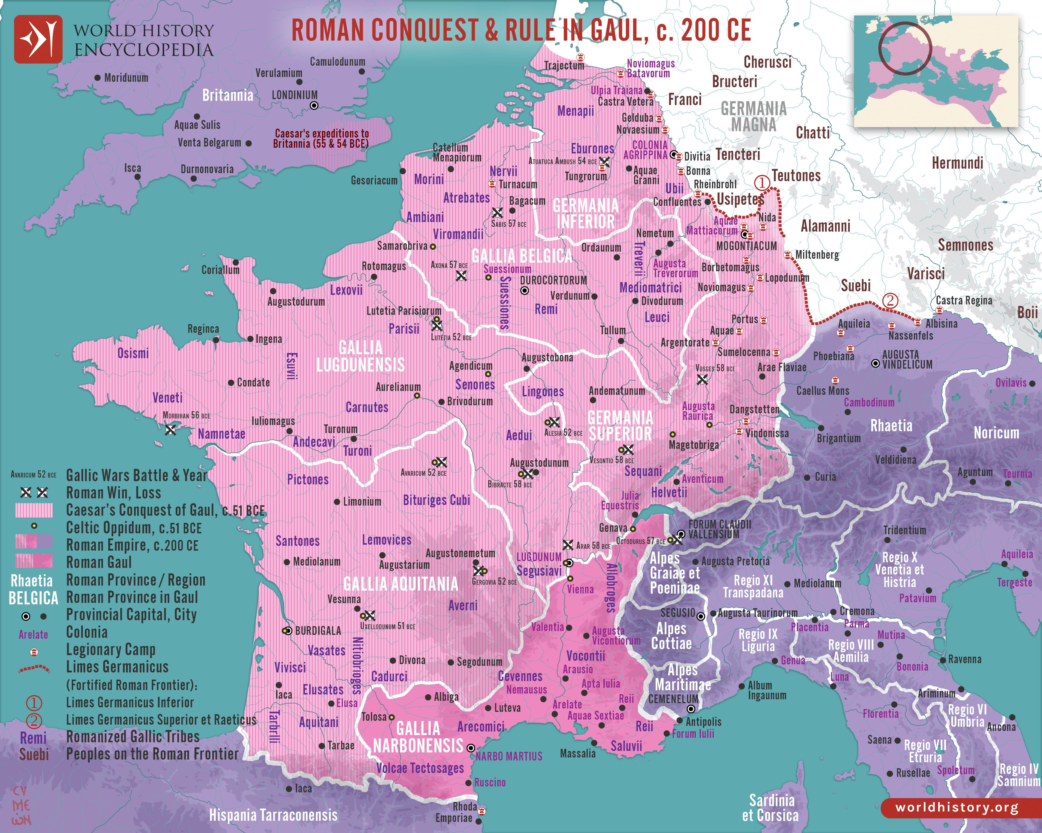 The Roman incorporation of Gaul began with the campaigns of Julius Caesar (58–51 BCE) and resulted in the gradual transformation of a diverse Celtic region into an integral part of the Roman world. By c. 200 CE, Gaul was organized into a structured provincial system including Gallia Narbonensis, Gallia Lugdunensis, Gallia Belgica, and the frontier provinces of Germania Inferior and Germania Superior. These northern provinces were closely tied to the Limes Germanicus, the fortified frontier along the Rhine that marked both a military boundary and a zone of interaction with non-Roman peoples. This administrative framework reflects the broader Roman approach to governance: combining direct rule, local elites, and military presence to secure stability and integrate newly conquered territories.