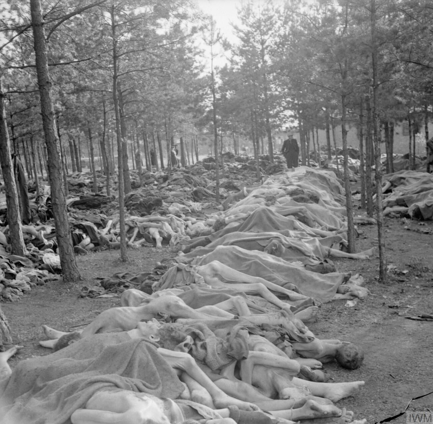 A photograph taken in April 1945 following the Allied capture of the Nazi concentration camp at Bergen-Belsen in northern Germany. The 13,000 bodies Allied soldiers found were to be buried in mass graves. 60,000 emaciated prisoners were released. (Imperial War Museums)