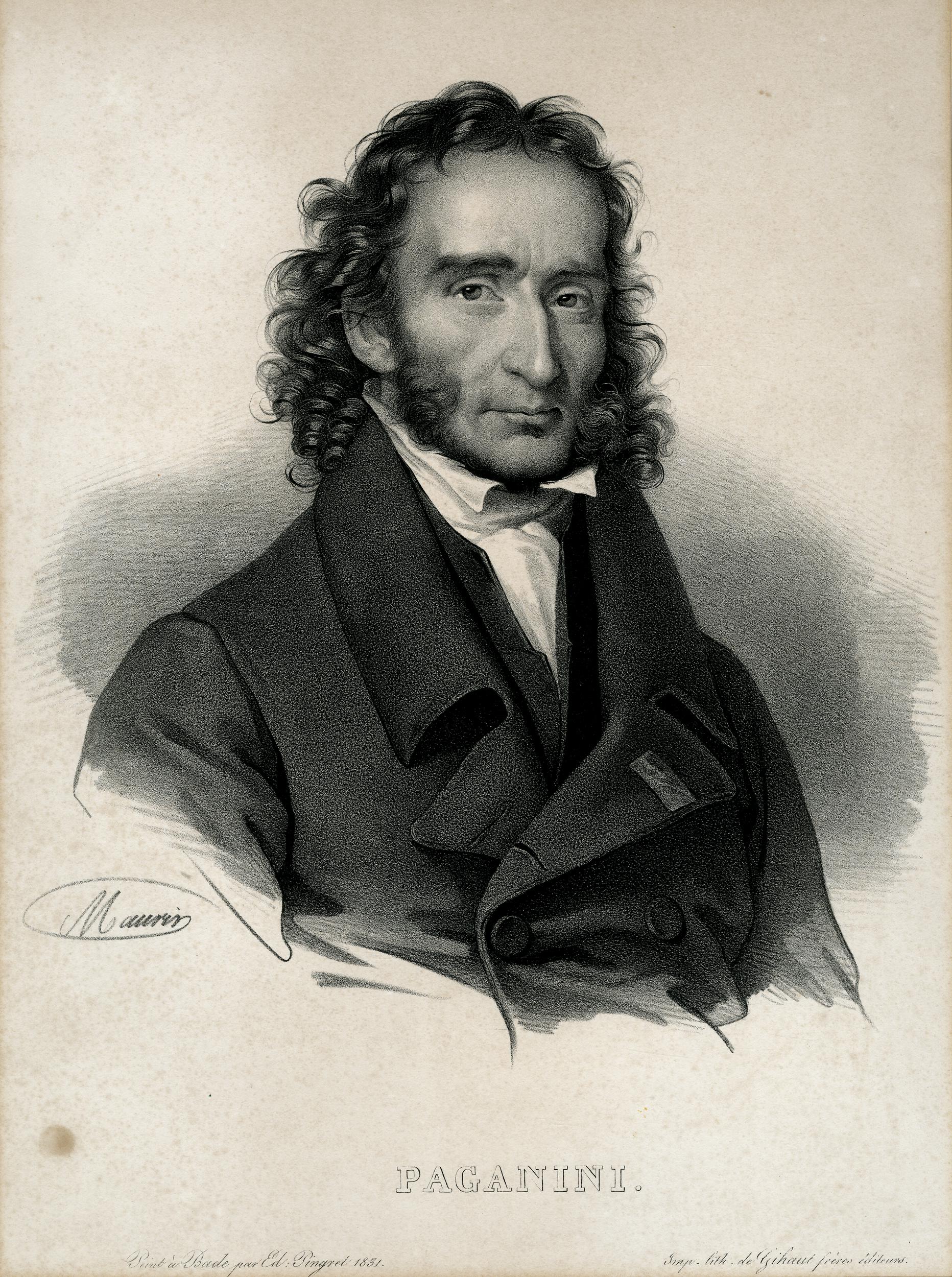 Niccolò Paganini, depicted in his most romantic guise, with tousled hair and gaunt cheeks, the product of his reliance on mercury and opium. Lithograph by Nicolas Eustache and Antoine Maurin, based on a painting by Pingret in Baden in 1831, now apparently lost, printed by the Gihaut Brothers.