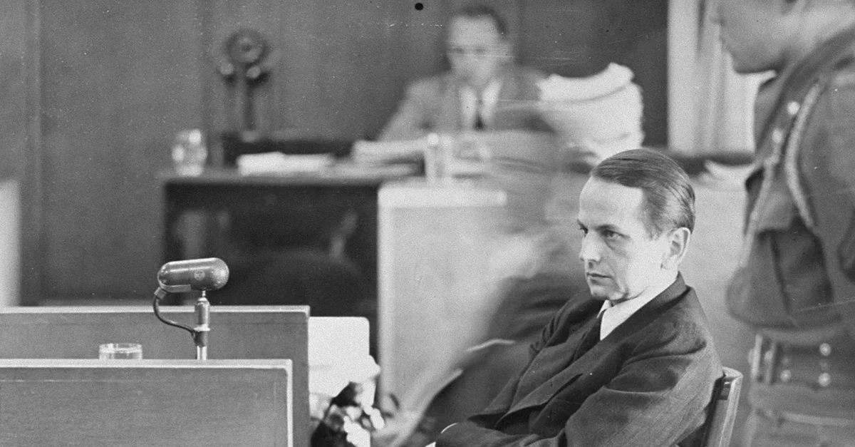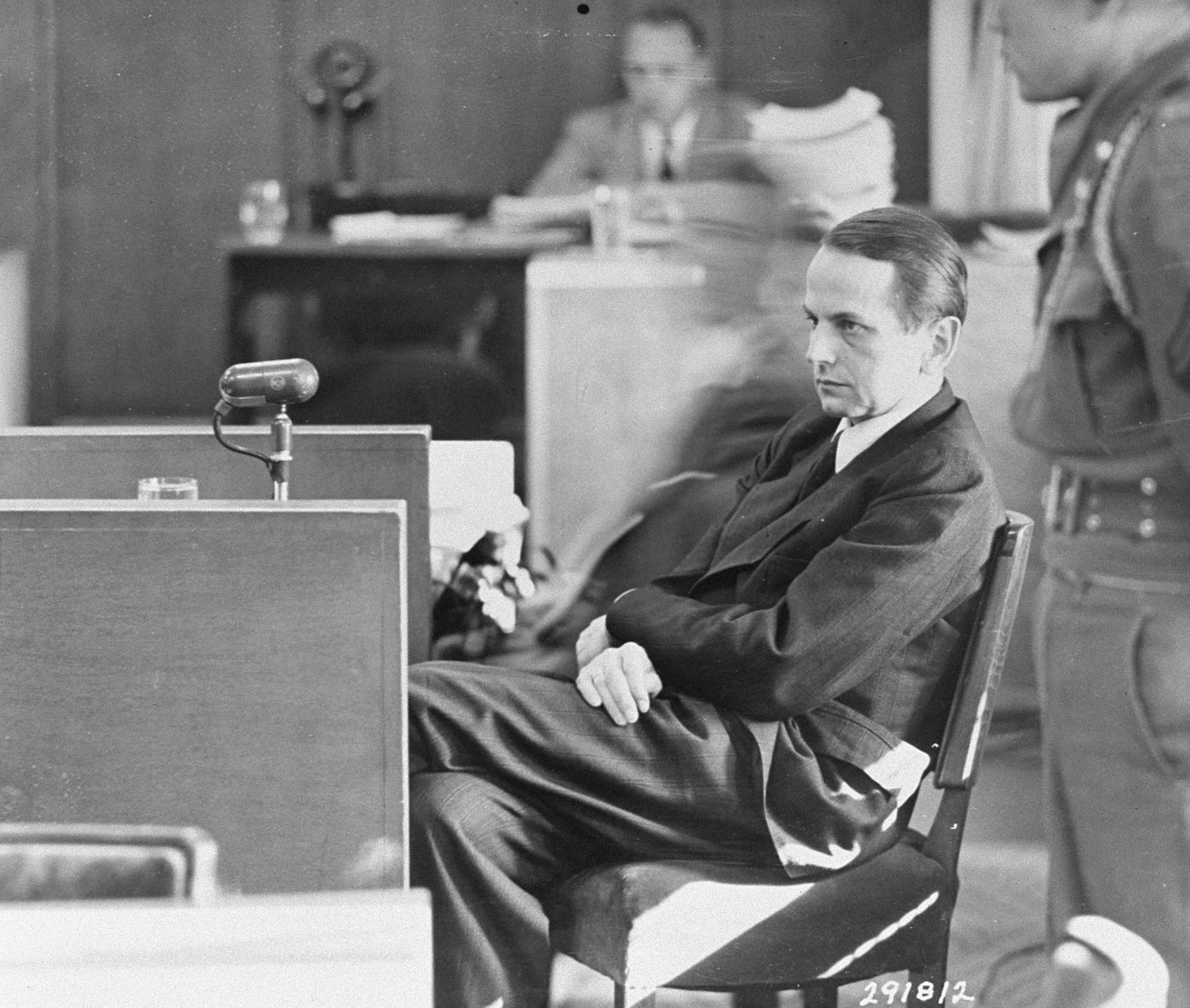Lieutenant-general Otto Ohlendorf during the Nuremberg trials. Ohlendorf was a German SS commander of Einsatzgruppen D operating on the Eastern Front. He was found guilty of war crimes and hanged in 1951. (United States Holocaust memorial Museum)