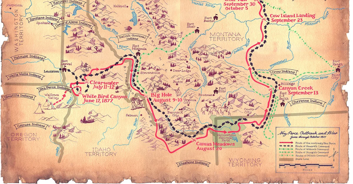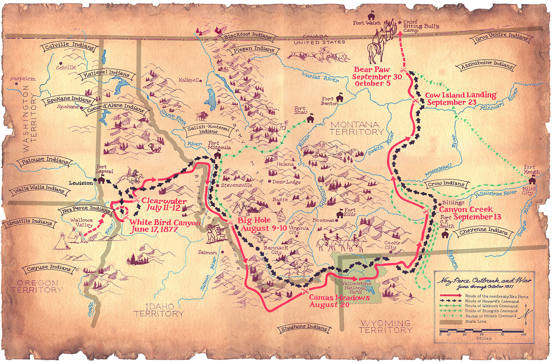Map of the flight of the Nez Perce toward Canada in 1877 and key battle sites of the Nez Perce War.