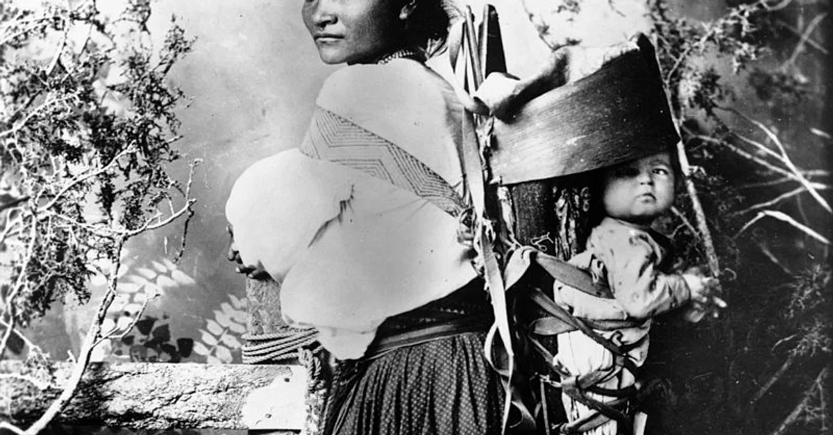 Studio portrait of a Native American (Navajo) woman with a child in a cradleboard on her back, c. 1880-1910.