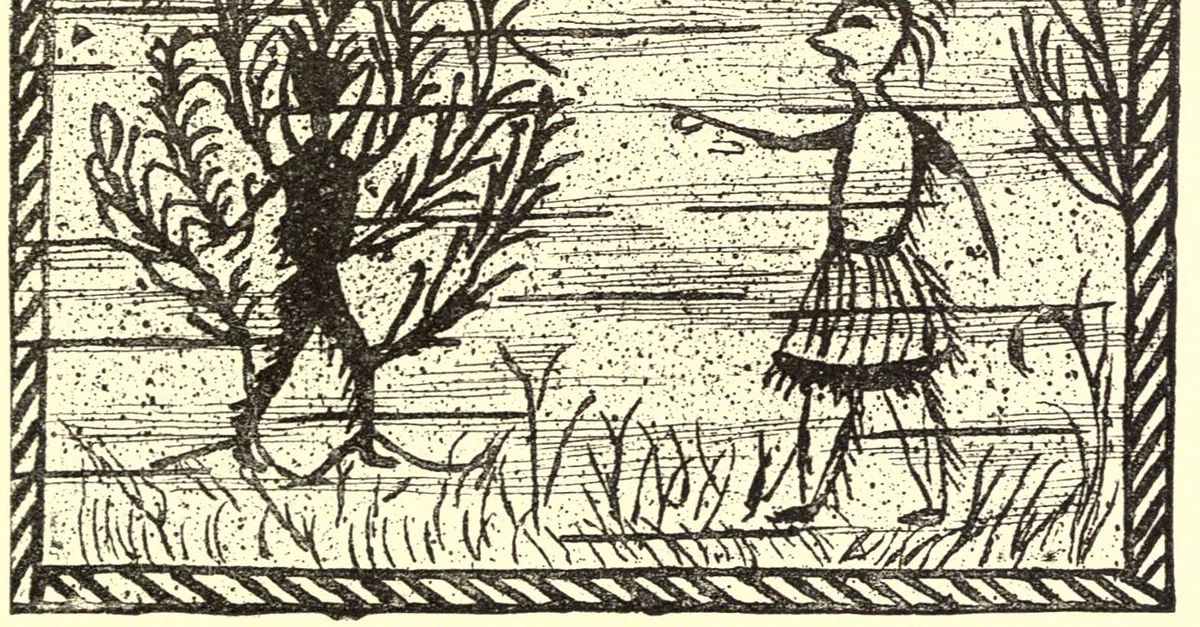 Glooscap Turning Man into a Cedar Tree, scraping on birchbark by Tomah Joseph, featured in The Algonquin Legends of New England by Charles Godfrey Leland, 1884.