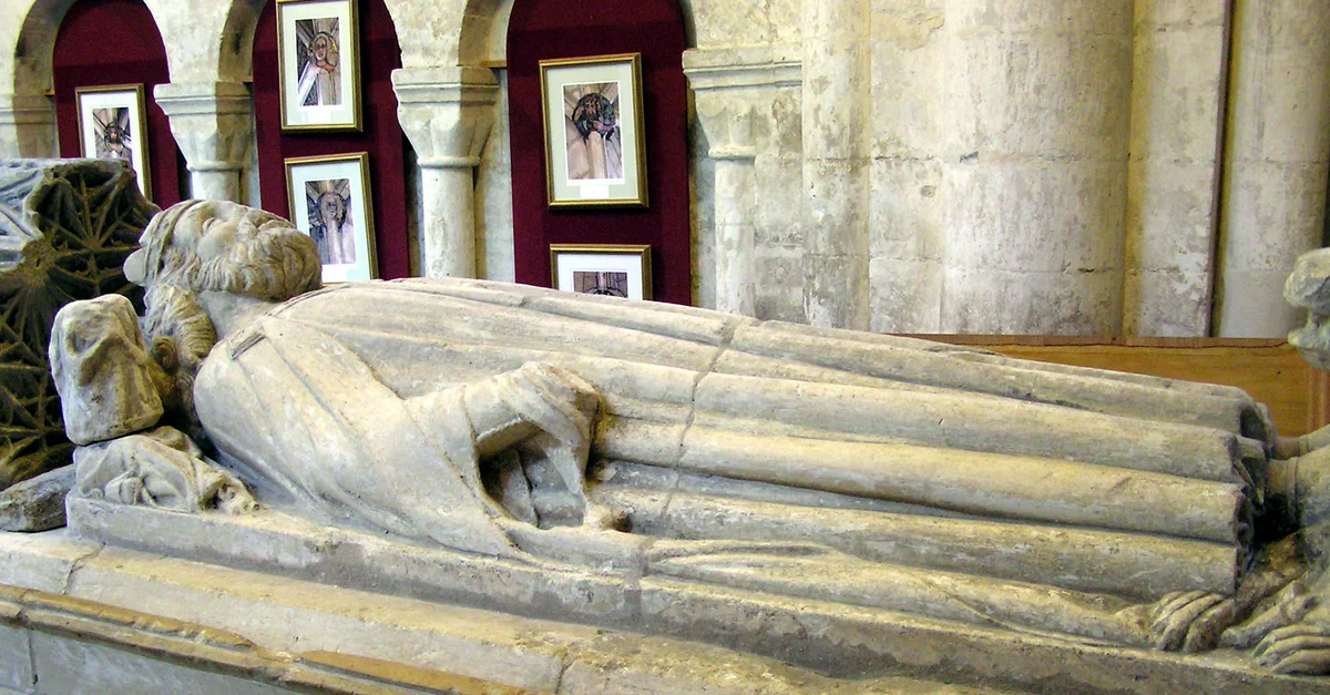 The tomb of King Aethelstan (r. 924-939) in Malmesbury Abbey, Malmesbury, England. There is nothing in the tomb beneath the statue, the relics of the king having been lost in the Dissolution of the Monasteries in 1539.