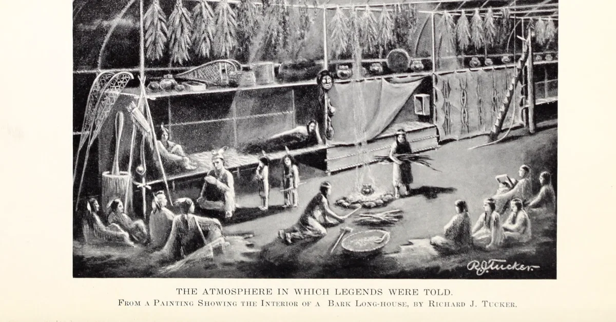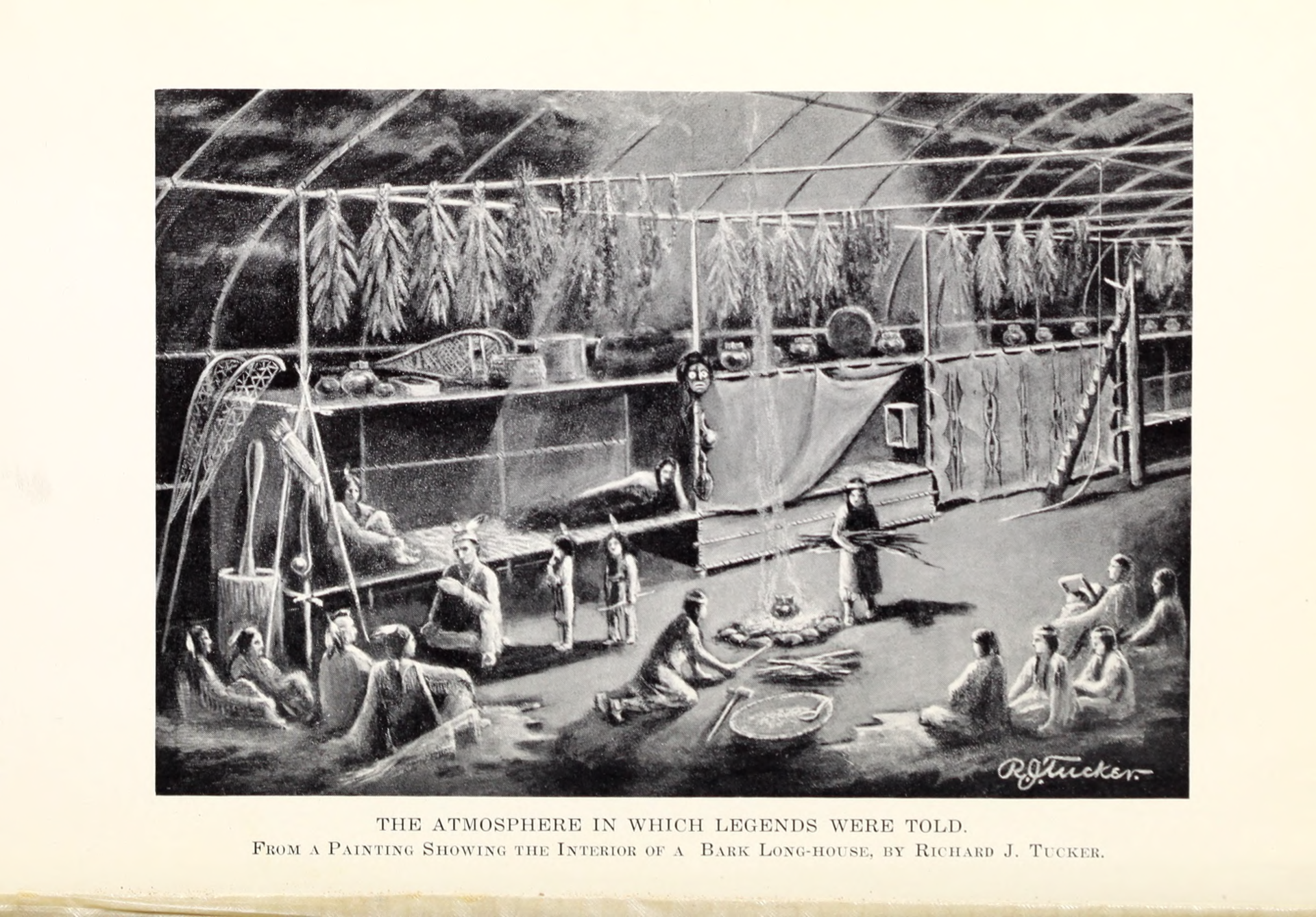 The Atmosphere In Which Legends Were Told, interior of Iroquois longhouse, painting by Richard J. Tucker (l. 1876-1956), featured as an illustration in Seneca Myths and Folk Tales by Arthur C. Parker, 1923.