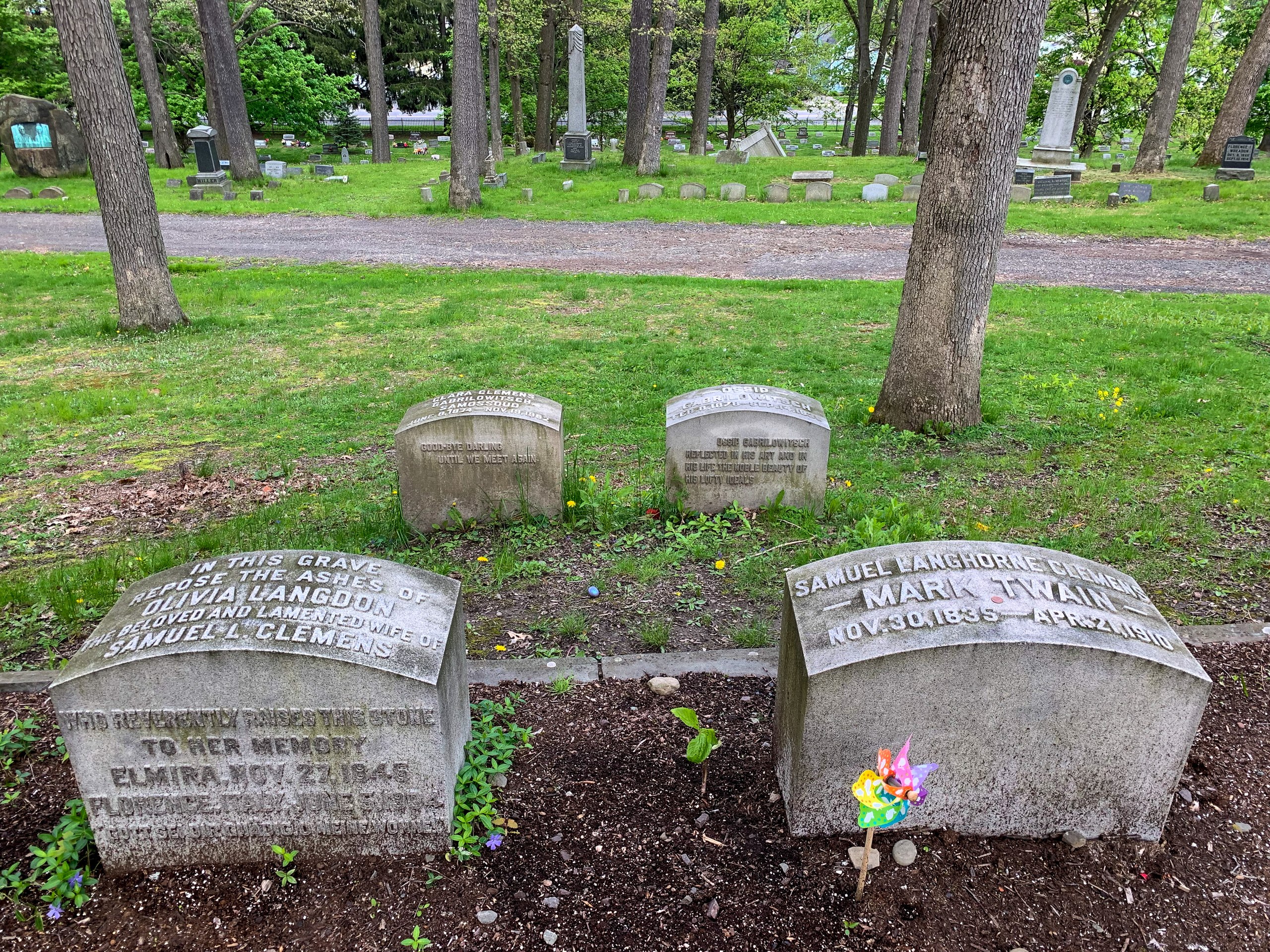 Graves of Olivia Langdon Clemens and Mark Twain at Woodlawn Cemetery, Elmira, New York.