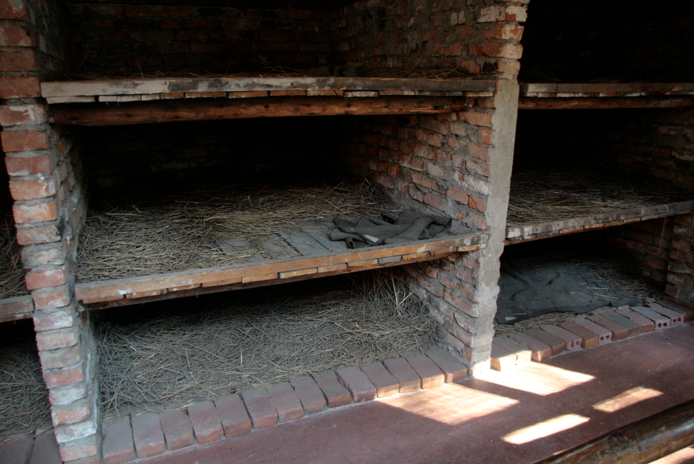 A reconstruction of brick bunks at Auschwitz concentration and extermination camp which was located in German-occupied Poland. Four to seven prisoners had to sleep in each compartment. Over one million people died in this complex at the hands of the Nazi SS. Auschwitz was one of the main instruments of the Holocaust.