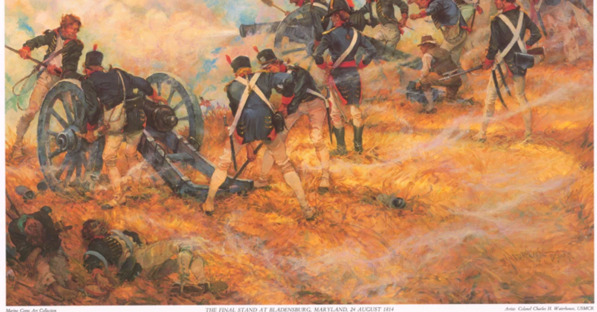 American artillery at the Battle of Bladensburg (24 August 1814) during the War of 1812. By Colonel Charles Waterhouse.