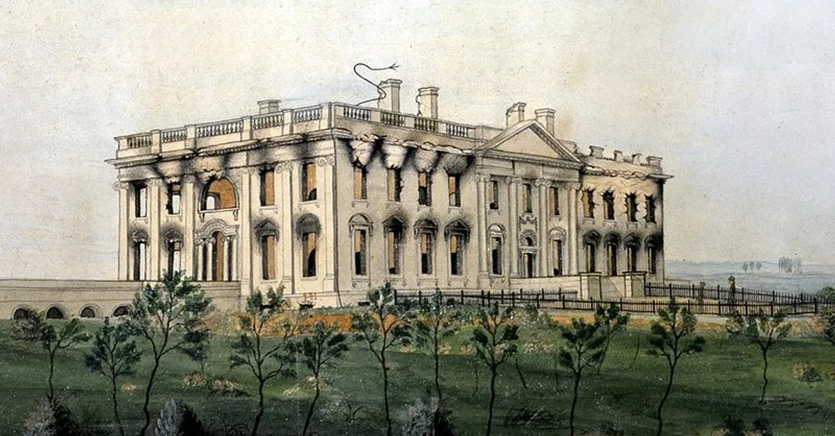 A depiction of the President's House (or White House) in the aftermath of the burning of Washington on 24 August 1814. Watercolor on paper, by George Munger, c. 1814.